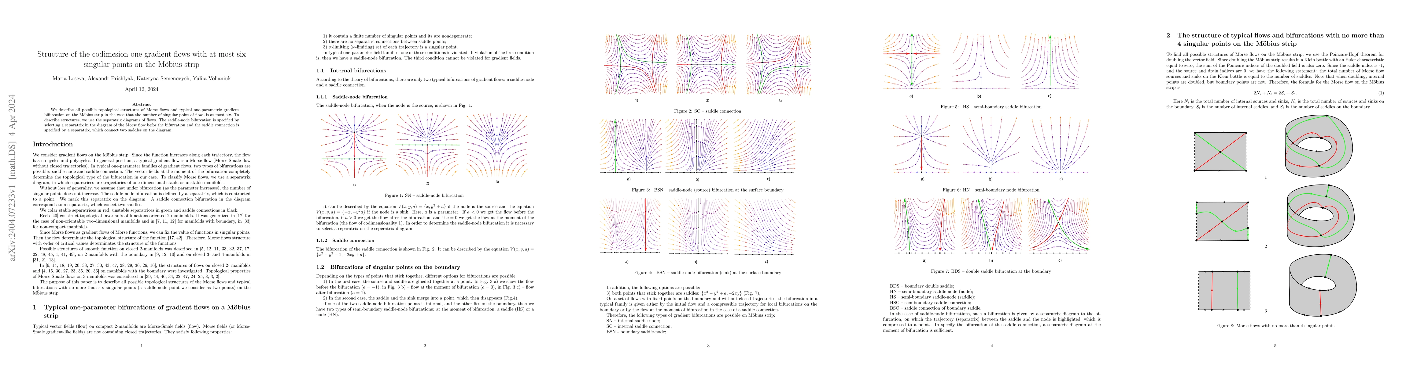 This paper investigates the topological structures of Morse flows and their gradient bifurcations on the Möbius strip, considering flows with up to six singular points. It employs separatrix diagrams to classify these structures, detailing saddle-node and saddle connection bifurcations.