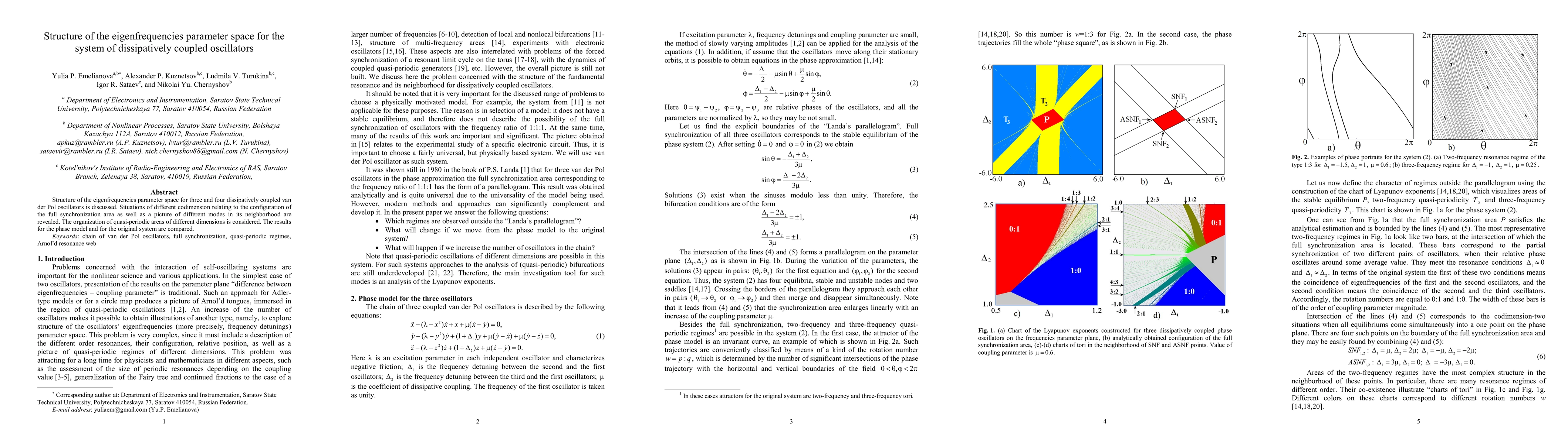 This paper explores the eigenfrequencies parameter space for three and four dissipatively coupled van der Pol oscillators, revealing configurations of full synchronization and quasi-periodic regions. Comparisons between the phase model and the original system are made to understand the dynamics better.