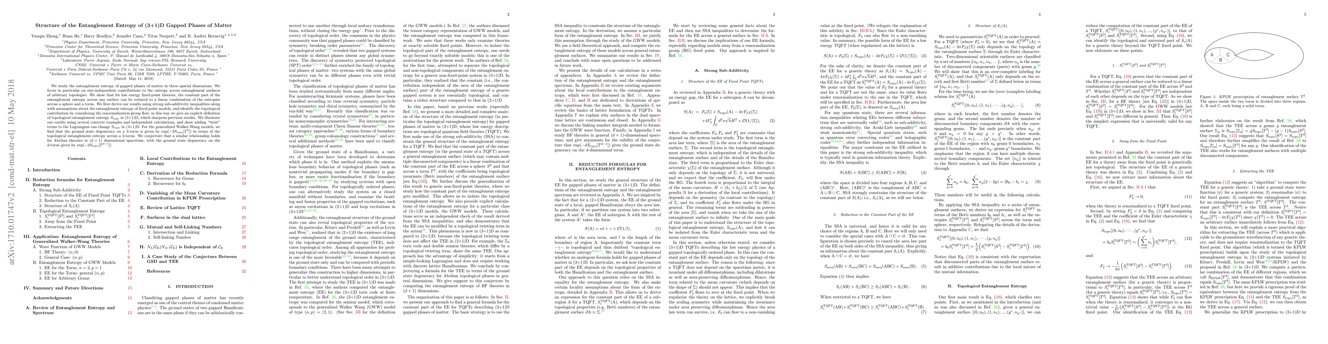 This paper investigates the entanglement entropy of gapped phases in (3+1)D, highlighting size-independent contributions. It defines a topological entanglement entropy $S_{\mathrm{topo}}$ for low energy fixed-point theories, showing its role in determining ground state degeneracies in generalized Walker-Wang models and proposing a similar relationship for Abelian theories in higher dimensions.
