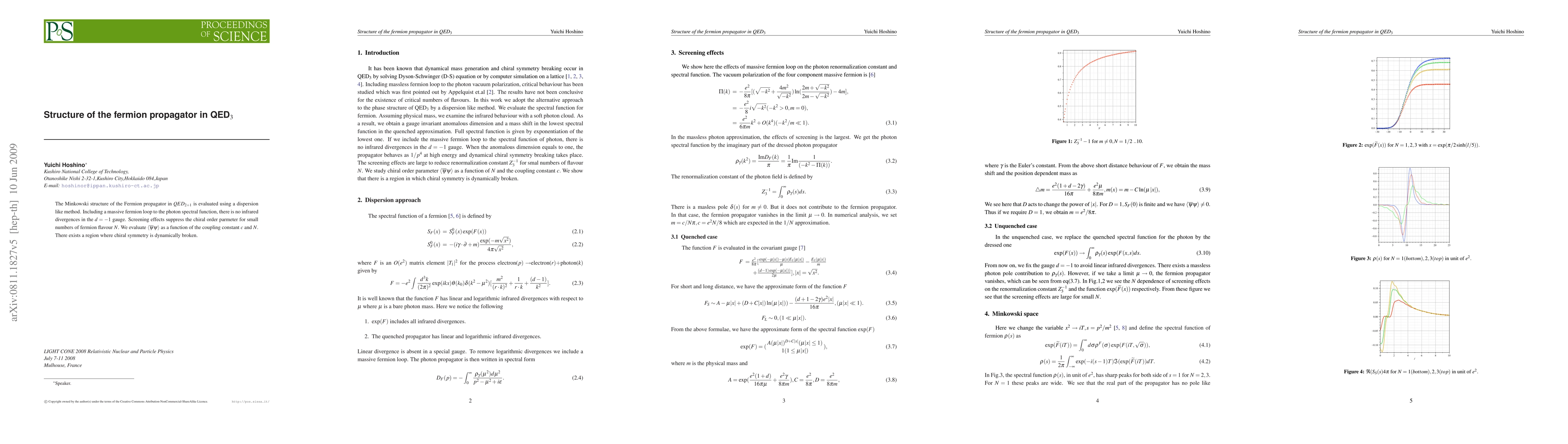 The research employs a dispersion-like method to evaluate the Minkowski structure of the Fermion propagator in QED2+1, including massive fermion loops in the photon spectral function to avoid infrared divergences in the d=-1 gauge.