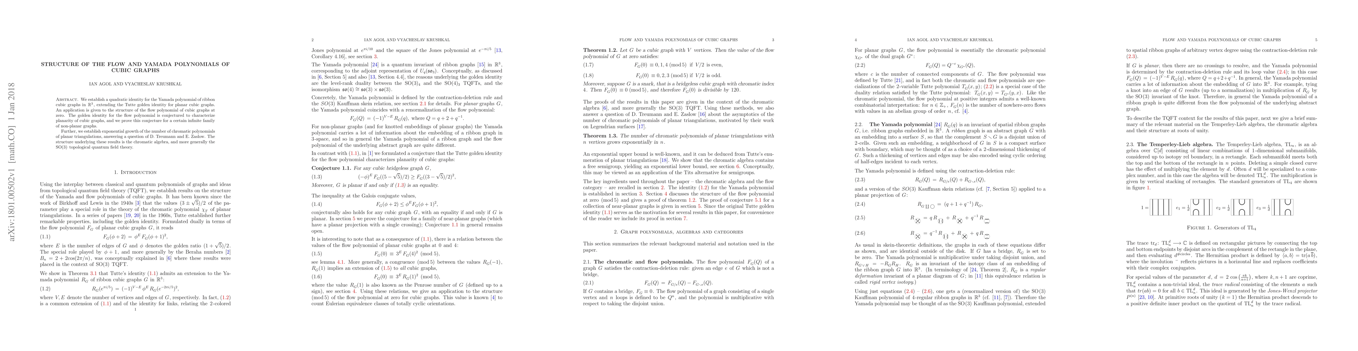 The paper establishes a quadratic identity for the Yamada polynomial of ribbon cubic graphs, extending Tutte’s golden identity to 3-dimensional space and proving its conjectured characterization of planarity for a specific non-planar graph family. Additionally, it addresses exponential growth in the number of chromatic polynomials of planar triangulations through the lens of chromatic algebra and SO(3) topological quantum field theory.