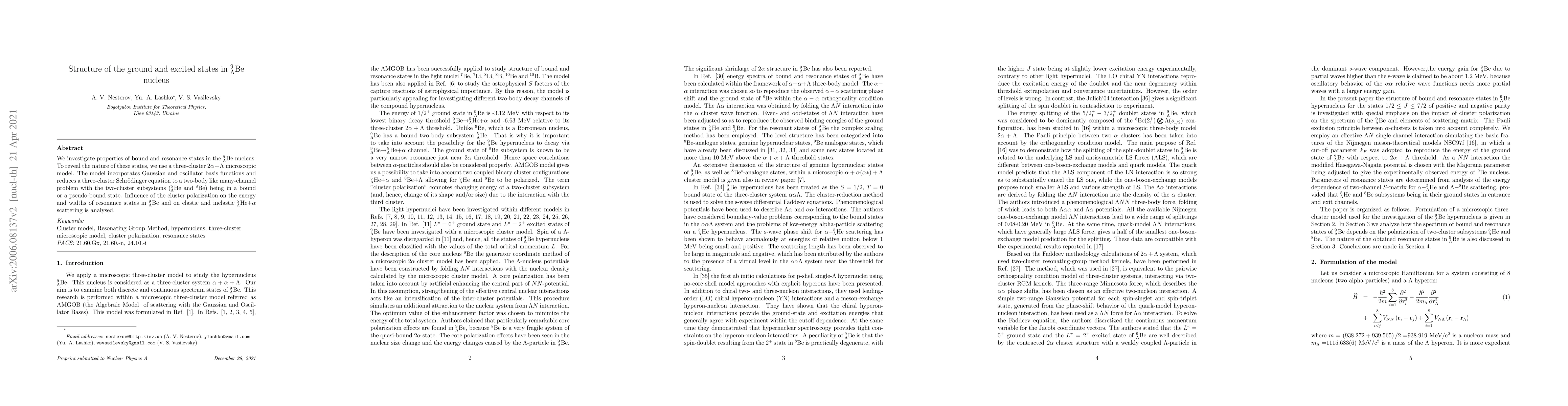 This paper explores the ground and excited states of the $_{\Lambda}^{9}$Be nucleus using a three-cluster microscopic model. The study reveals the nature of bound and resonance states through a two-body many-channel problem, focusing on the impact of cluster polarization on energy, widths, and scattering processes.