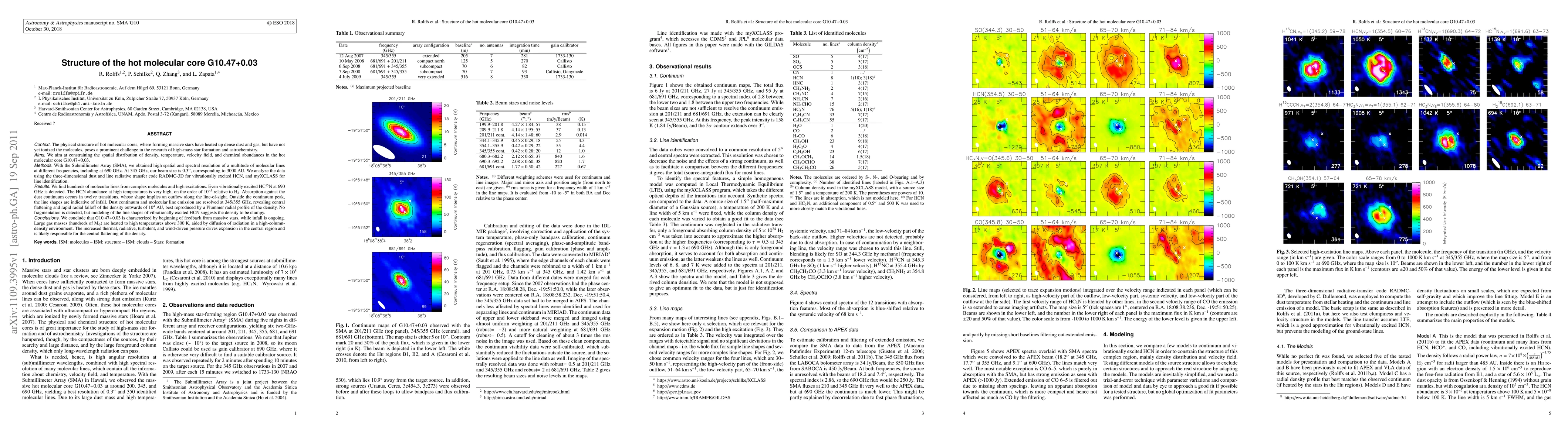 The physical structure of hot molecular cores, where forming massive stars have heated up dense dust and gas, but have not yet ionized the molecules, poses a prominent challenge in the research of high-mass star formation and astrochemistry. We aim at constraining the spatial distribution of density, temperature, velocity field, and chemical abundances in the hot molecular core G10.47+0.03. With the Submillimeter Array (SMA), we obtained high spatial and spectral resolution of a multitude of molecular lines at different frequencies, including at 690 GHz. At 345 GHz, our beam size is 0.3", corresponding to 3000 AU. We analyze the data using the three-dimensional dust and line radiative transfer code RADMC-3D, and myXCLASS for line identification. We find hundreds of molecular lines from complex molecules and high excitations. Even vibrationally excited HC15N at 690 GHz is detected. The HCN abundance at high temperatures is very high. Absorption against the dust continuum occurs in twelve transitions, whose shape implies an outflow along the line-of-sight. Outside the continuum peak, the line shapes are indicative of infall. Dust continuum and molecular line emission are resolved at 345 GHz, revealing central flattening and rapid radial falloff of the density outwards of 10^4 AU, best reproduced by a Plummer radial profile of the density. No fragmentation is detected, but modeling of the line shapes of vibrationally excited HCN suggests the density to be clumpy. We conclude that G10.47+0.03 is characterized by beginning of feedback from massive stars, while infall is ongoing. Large gas masses (hundreds of Msun) are heated to high temperatures, aided by diffusion of radiation in a high-column-density environment. The increased thermal, radiative, turbulent, and wind-driven pressure drives expansion in the central region and is likely responsible for the central flattening of the density.