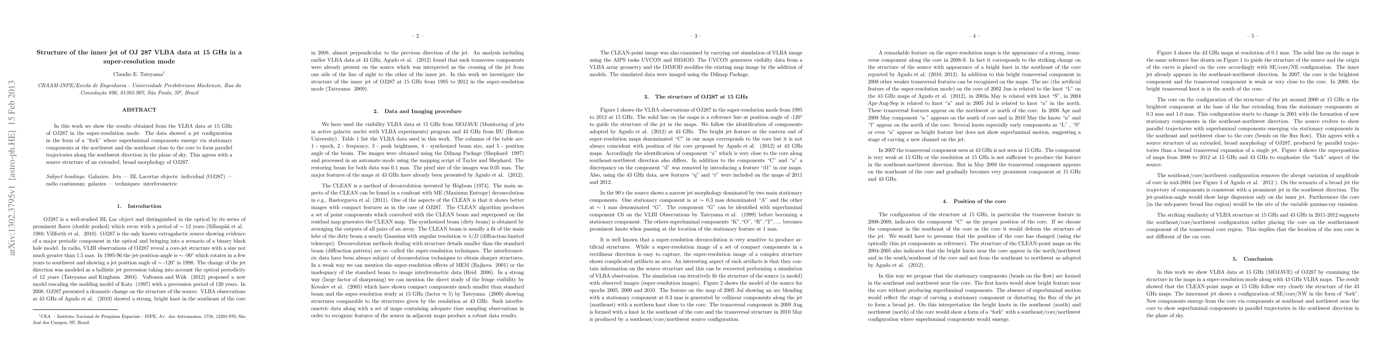 In this work we show the results obtained from the VLBA data at 15 GHz of OJ 287 in the super-resolution mode. The data showed a jet configuration in the form of "fork" where superluminal components emerge via stationary components at the northwest and the southeast close to the core to form parallel trajectories along the southwest direction in the plane of the sky. This agrees with a source structure of an extended, broad morphology of OJ 287.