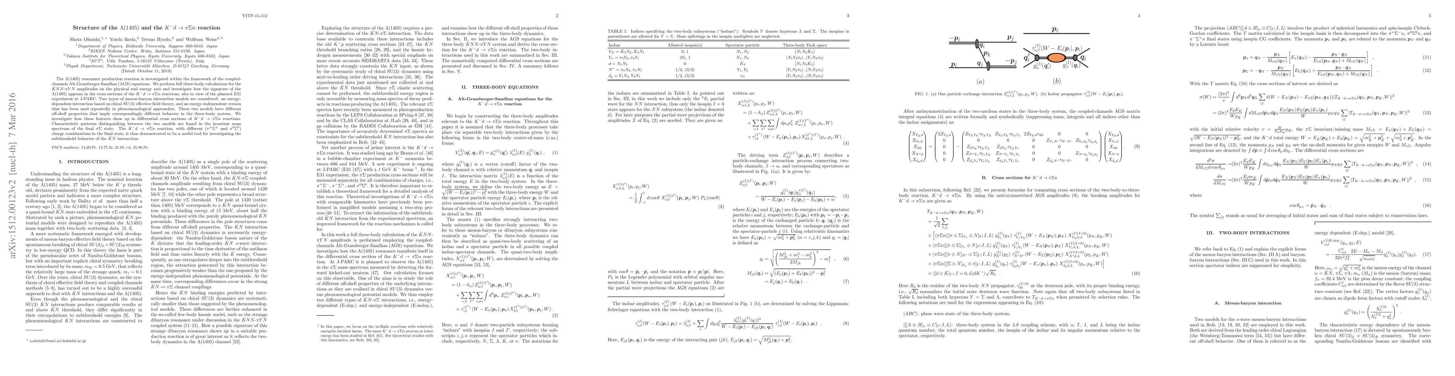 This paper investigates the $\Lambda(1405)$ resonance production using coupled-channels AGS equations and full three-body calculations for $\bar{K}NN-\pi YN$ amplitudes. It compares two meson-baryon interaction models to analyze their differential cross sections in the $K^-d\rightarrow \pi\Sigma n$ reaction, revealing distinct patterns in the invariant mass spectrum of the final $\pi\Sigma$ state.