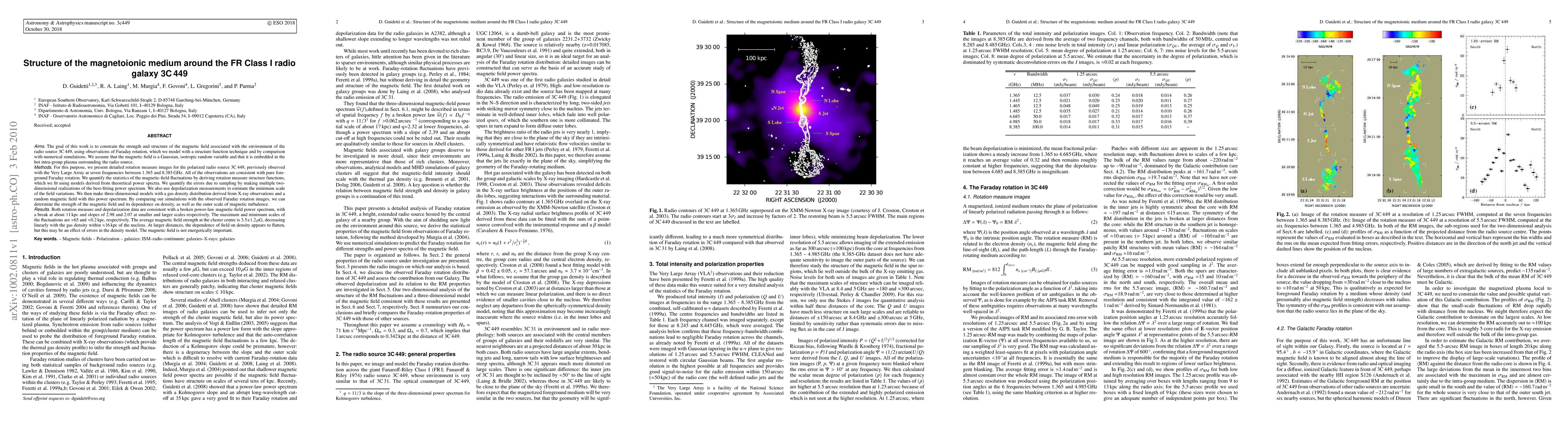 The goal of this work is to constrain the strength and structure of the magnetic field associated with the environment of the radio source 3C 449, using observations of Faraday rotation, which we model with a structure function technique and by comparison with numerical simulations. We assume that the magnetic field is a Gaussian, isotropic random variable and that it is embedded in the hot intra-group plasma surrounding the radio source. For this purpose, we present detailed rotation measure images for the polarized radio source 3C 449, previously observed with the Very Large Array at seven frequencies between 1.365 and 8.385 GHz. We quantify the statistics of the magnetic-field fluctuations by deriving rotation measure structure functions, which we fit using models derived from theoretical power spectra. We quantify the errors due to sampling by making multiple two-dimensional realizations of the best-fitting power spectrum.We also use depolarization measurements to estimate the minimum scale of the field variations. We then make three-dimensional models with a gas density distribution derived from X-ray observations and a random magnetic field with this power spectrum. Under these assumptions we find that both rotation measure and depolarization data are consistent with a broken power-law magnetic-field power spectrum, with a break at about 11 kpc and slopes of 2.98 and 2.07 at smaller and larger scales respectively. The maximum and minimum scales of the fluctuations are around 65 and 0.2 kpc, respectively. The average magnetic field strength at the cluster centre is 3.5 +/-1.2 micro-G, decreasing linearly with the gas density within about 16 kpc of the nucleus.