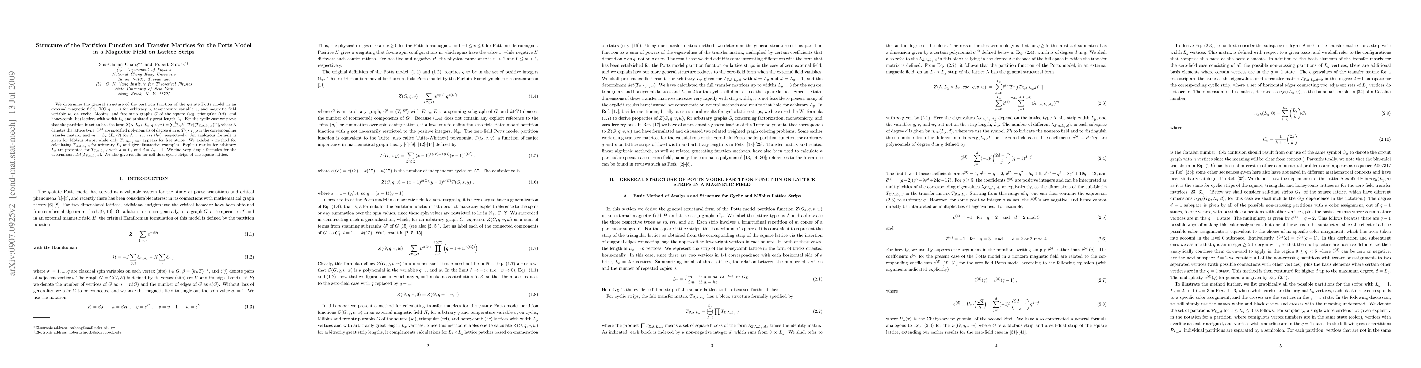 This paper explores the partition function structure of the $q$-state Potts model in a magnetic field on various strip lattices, deriving a general formula for cyclic strips and providing explicit results for transfer matrices and determinants. It also discusses analogous formulas for Möbius and free strips.