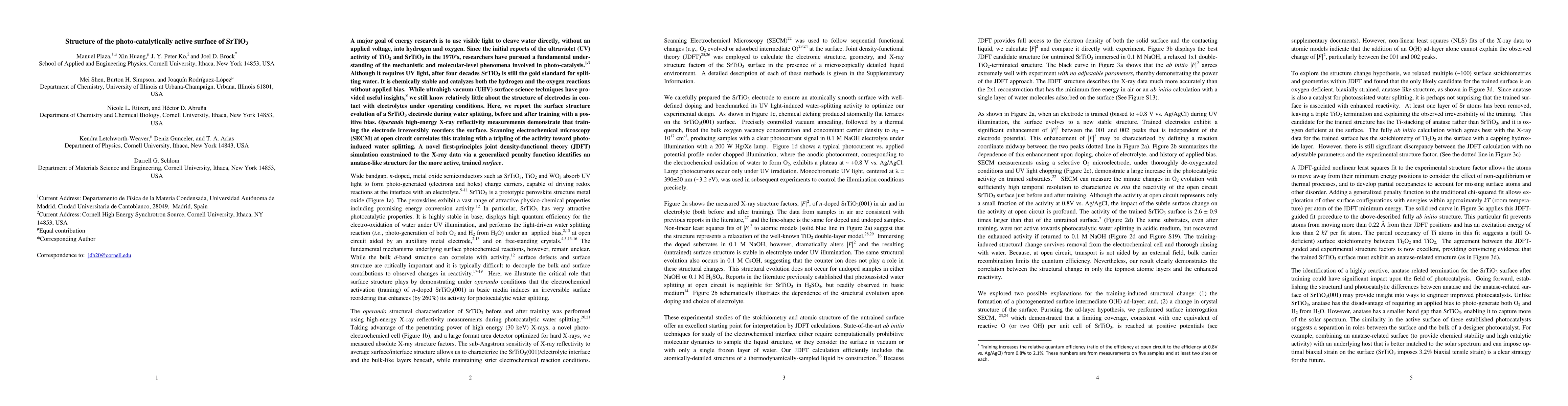 A major goal of energy research is to use visible light to cleave water directly, without an applied voltage, into hydrogen and oxygen. Since the initial reports of the ultraviolet (UV) activity of TiO2 and SrTiO3 in the 1970s, researchers have pursued a fundamental understanding of the mechanistic and molecular-level phenomena involved in photo-catalysis. Although it requires UV light, after four decades SrTiO3 is still the gold standard for splitting water. It is chemically stable and catalyzes both the hydrogen and the oxygen reactions without applied bias. While ultrahigh vacuum (UHV) surface science techniques have provided useful insights, we still know relatively little about the structure of electrodes in contact with electrolytes under operating conditions. Here, we report the surface structure evolution of a SrTiO3 electrode during water splitting, before and after training with a positive bias. Operando high-energy X-ray reflectivity measurements demonstrate that training the electrode irreversibly reorders the surface. Scanning electrochemical microscopy (SECM) at open circuit correlates this training with a tripling of the activity toward photo-induced water splitting. A novel first-principles joint density-functional theory (JDFT) simulation constrained to the X-ray data via a generalized penalty function identifies an anatase-like structure for the more active, trained surface.