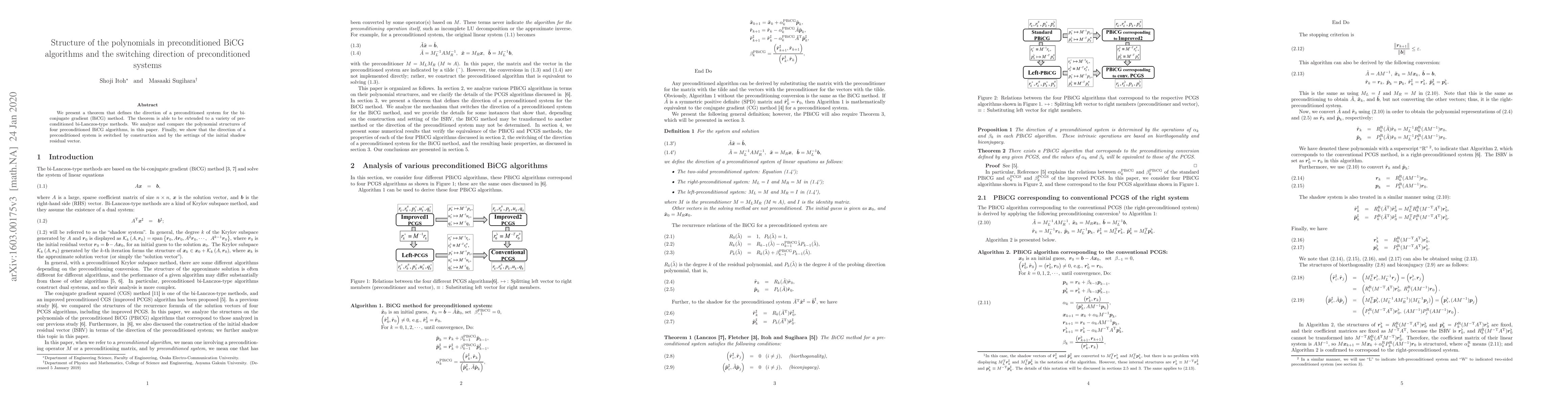 A research paper introduces a theorem that defines the direction of a preconditioned system for BiCG algorithms and shows that the direction is switched by construction or initial shadow residual vector settings. It also analyzes the polynomial structures of four BiCG algorithms.