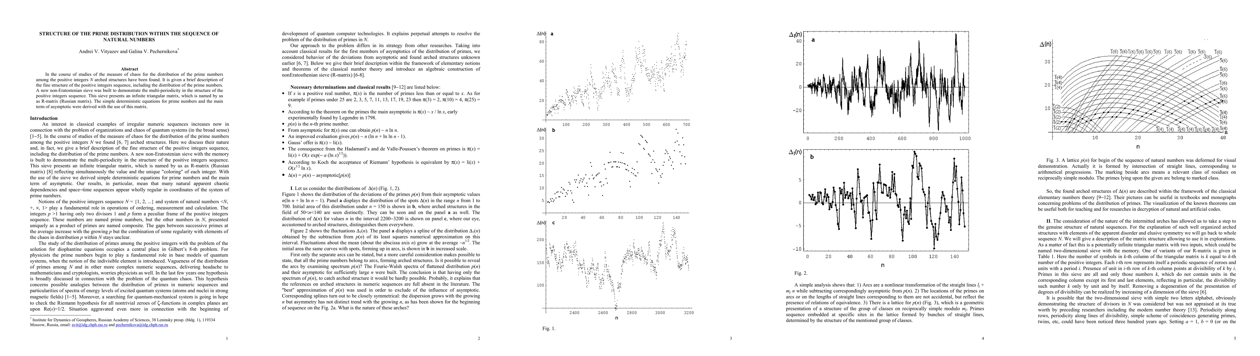 In the course of studies of the measure of chaos for the distribution of the prime numbers among the positive integers N arched structures have been found. It is given a brief description of the fine structure of the positive integers sequence, including the distribution of the prime numbers. A new non-Eratostenian sieve was built to demonstrate the multi-periodicity in the structure of the positive integers sequence. This sieve presents an infinite triangular matrix, which is named by us as R-matrix (Russian matrix). The simple deterministic equations for prime numbers and the main term of asymptotic were derived with the use of this matrix.