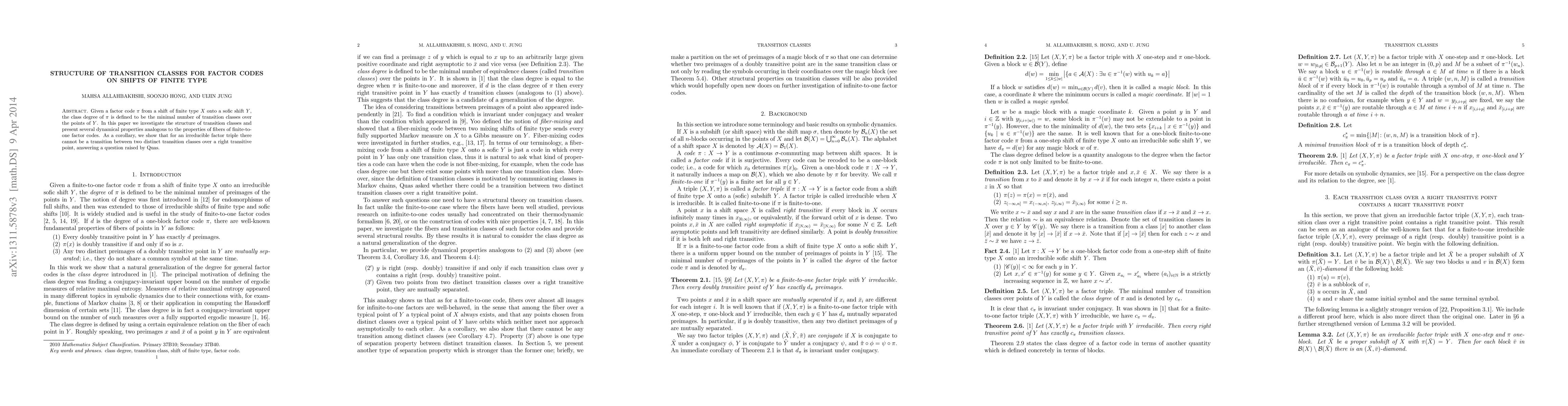 Given a factor code $\pi$ from a shift of finite type $X$ onto a sofic shift $Y$, the class degree of $\pi$ is defined to be the minimal number of transition classes over points of $Y$. In this paper we investigate structure of transition classes and present several dynamical properties analogous to the properties of fibers of finite-to-one codes. As a corollary, we show that for an irreducible factor triple there cannot be a transition between two different transition classes over a right transitive point, answering a question raised by Quas.