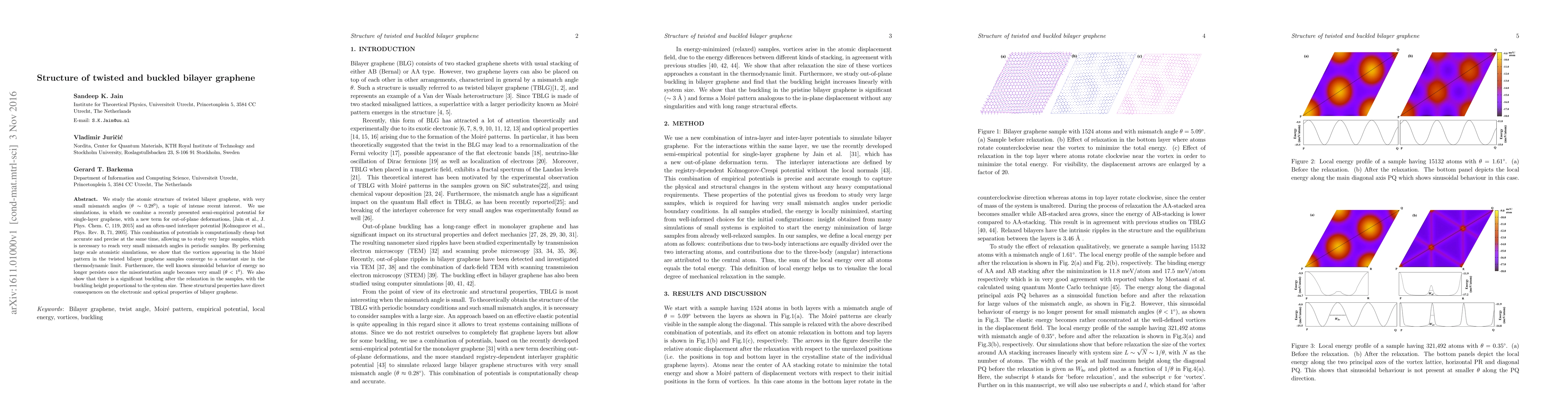 We study the atomic structure of twisted bilayer graphene, with very small mismatch angles ($\theta \sim 0.28^0$), a topic of intense recent interest. We use simulations, in which we combine a recently presented semi-empirical potential for single-layer graphene, with a new term for out-of-plane deformations, [Jain et al., J. Phys. Chem. C, 119, 2015] and an often-used interlayer potential [Kolmogorov et al., Phys. Rev. B, 71, 2005]. This combination of potentials is computationally cheap but accurate and precise at the same time, allowing us to study very large samples, which is necessary to reach very small mismatch angles in periodic samples. By performing large scale atomistic simulations, we show that the vortices appearing in the Moir\'e pattern in the twisted bilayer graphene samples converge to a constant size in the thermodynamic limit. Furthermore, the well known sinusoidal behavior of energy no longer persists once the misorientation angle becomes very small ($\theta<1^0$). We also show that there is a significant buckling after the relaxation in the samples, with the buckling height proportional to the system size. These structural properties have direct consequences on the electronic and optical properties of bilayer graphene.