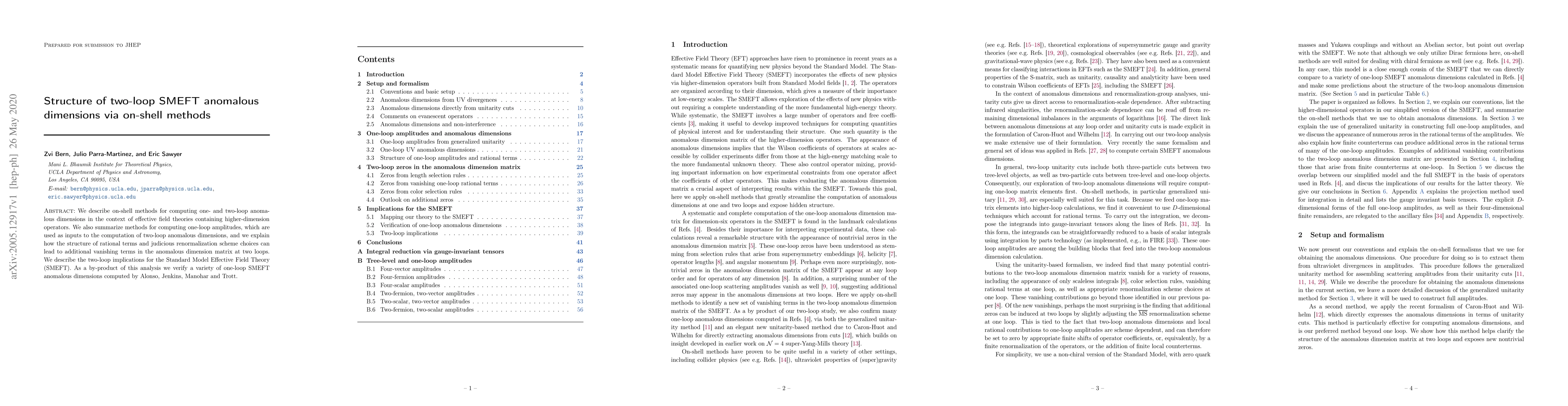 The paper presents a systematic application of on-shell methods to compute anomalous dimensions and associated scattering amplitudes at one and two loops, uncovering new structures in the form of vanishing terms in the anomalous dimension matrix of the SMEFT beyond one loop.