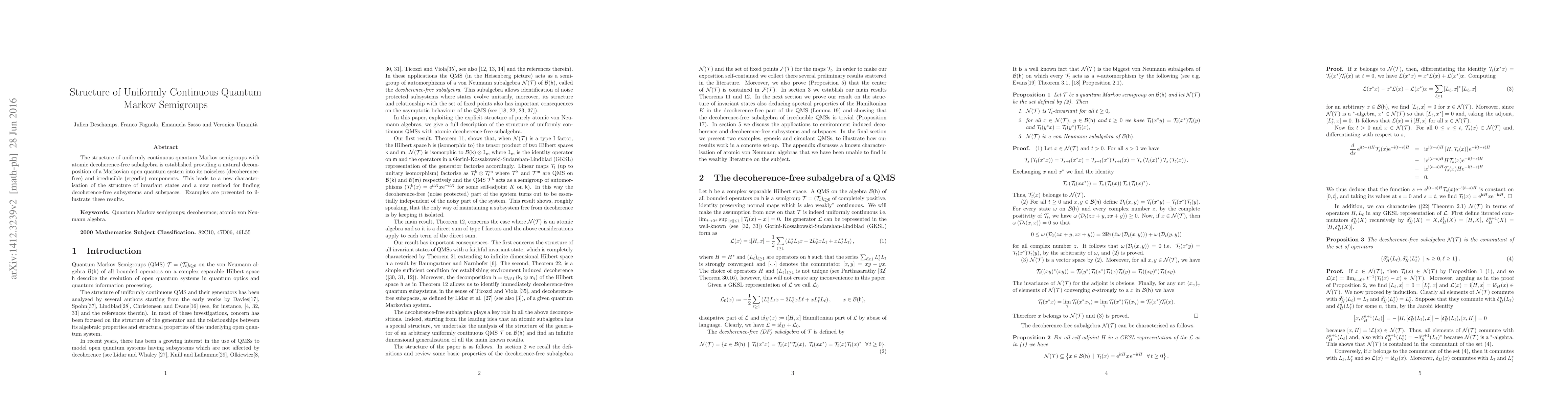 This paper establishes the structure of uniformly continuous quantum Markov semigroups, revealing a decomposition of Markovian open quantum systems into noiseless and irreducible components, and introduces a new method for identifying decoherence-free subsystems and subspaces. Examples are provided to demonstrate these findings.