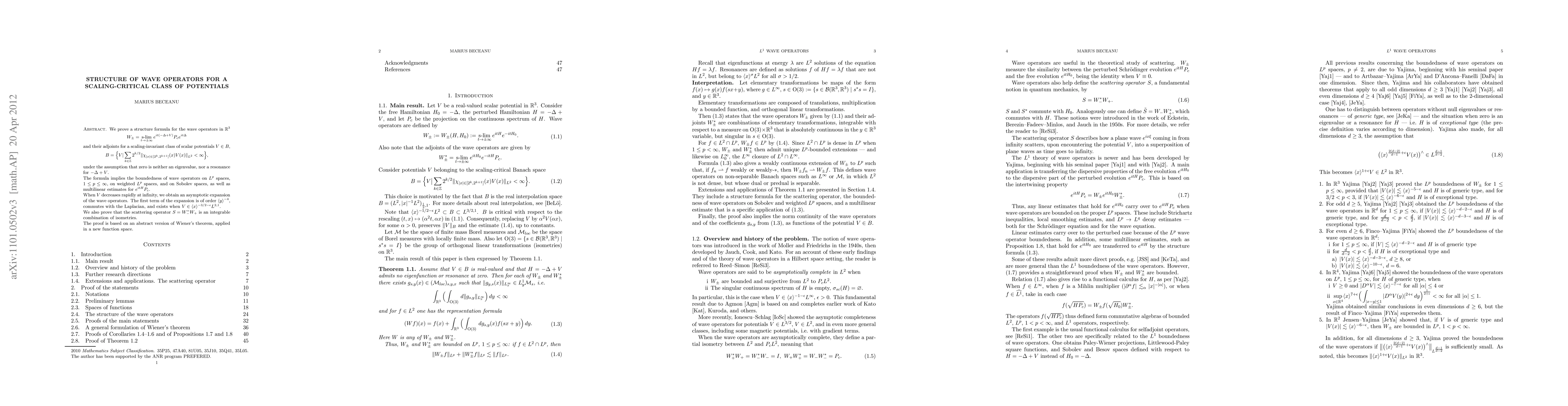This paper establishes a structure formula for wave operators in R^3 for a class of scalar potentials, proving their boundedness on various function spaces and deriving multilinear estimates. An asymptotic expansion of the wave operators is also provided under rapid decay conditions on the potential, with the first term commuting with the Laplacian. The scattering operator is shown to be an integrable combination of isometries, with the proof relying on an abstract Wiener's theorem in a novel function space.