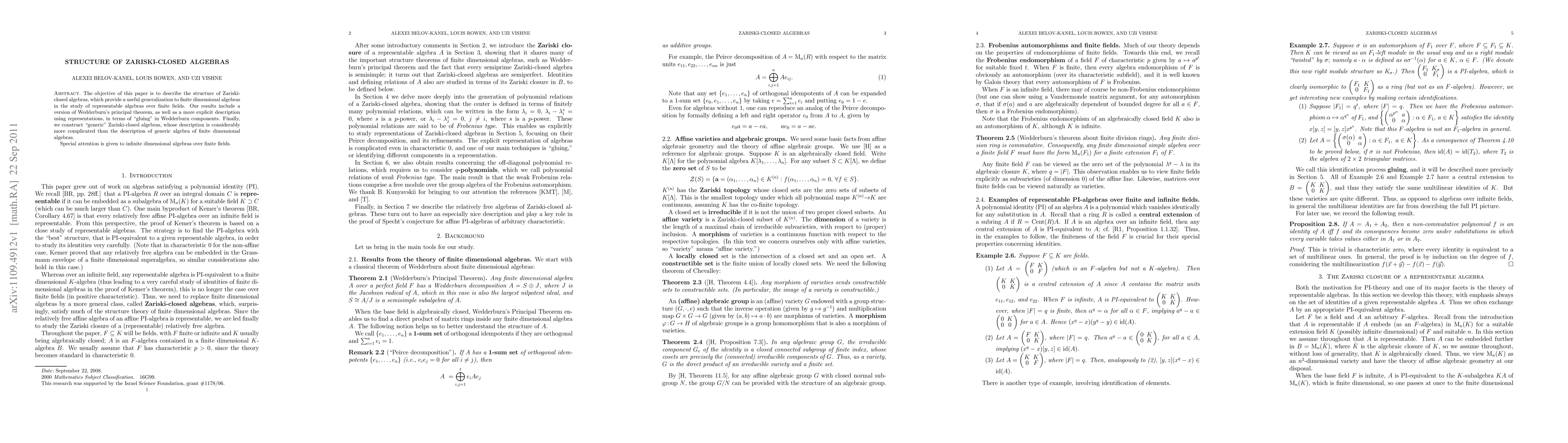 This paper explores the structure of Zariski-closed algebras, providing a generalization of finite dimensional algebras over finite fields. It includes a version of Wedderburn's theorem and a detailed representation-based description through "gluing" of Wedderburn components, with special focus on the more complex nature of infinite dimensional algebras.