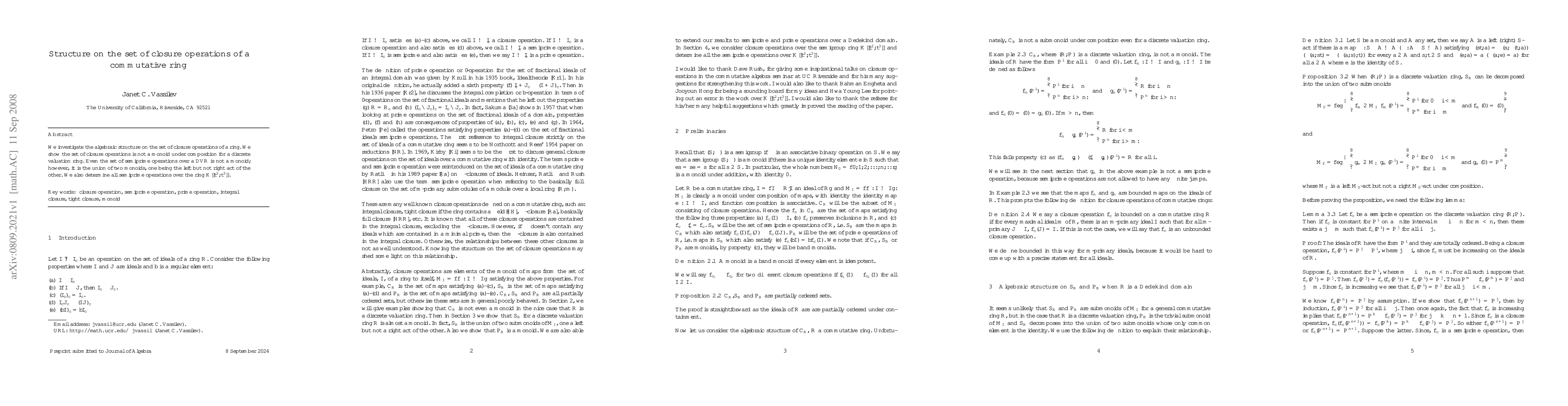 This paper examines the algebraic structure of closure operations in a commutative ring, demonstrating that the set of these operations is not a monoid under composition in the case of a discrete valuation ring (DVR). It further reveals that while the set of semiprime closure operations over a DVR is not a monoid, it can be decomposed into the union of two monoids with specific act relations. Additionally, the study identifies all semiprime operations for the ring $K[[t^2, t^3]]$.