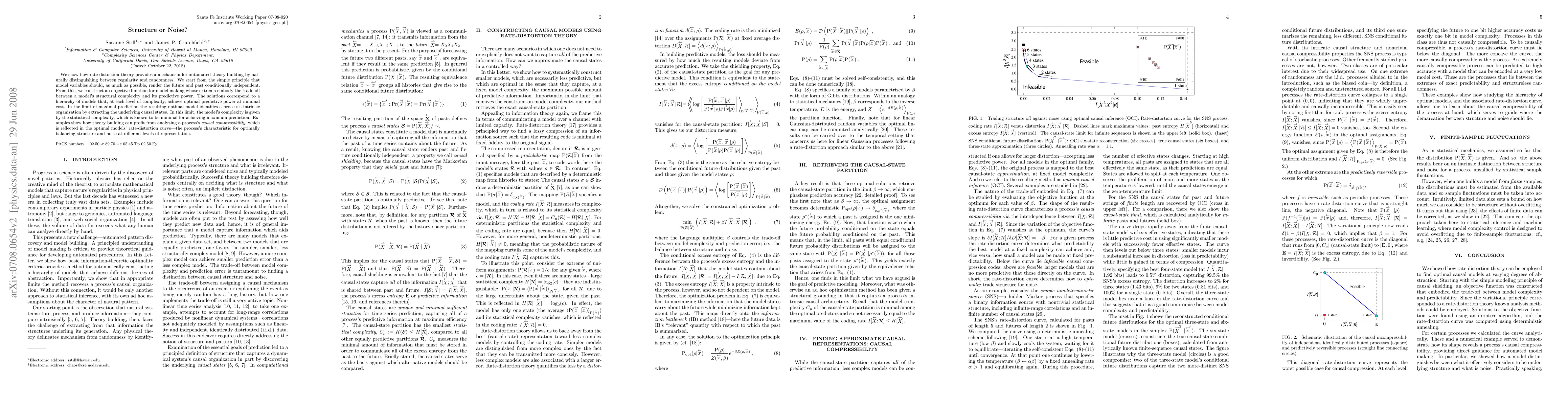 We show how rate-distortion theory provides a mechanism for automated theory building by naturally distinguishing between regularity and randomness. We start from the simple principle that model variables should, as much as possible, render the future and past conditionally independent. From this, we construct an objective function for model making whose extrema embody the trade-off between a model's structural complexity and its predictive power. The solutions correspond to a hierarchy of models that, at each level of complexity, achieve optimal predictive power at minimal cost. In the limit of maximal prediction the resulting optimal model identifies a process's intrinsic organization by extracting the underlying causal states. In this limit, the model's complexity is given by the statistical complexity, which is known to be minimal for achieving maximum prediction. Examples show how theory building can profit from analyzing a process's causal compressibility, which is reflected in the optimal models' rate-distortion curve--the process's characteristic for optimally balancing structure and noise at different levels of representation.