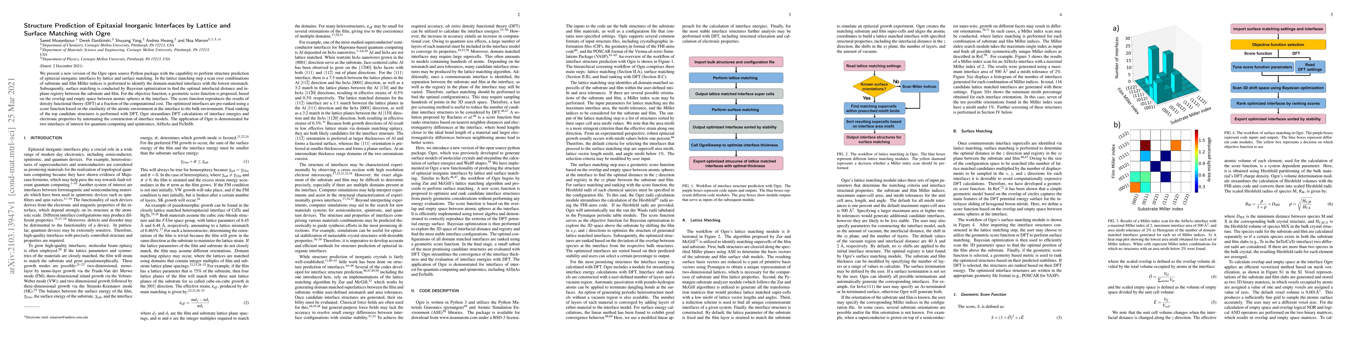This paper introduces a new version of the Ogre Python package for predicting epitaxial inorganic interfaces through lattice and surface matching. It employs lattice matching and Bayesian optimization for surface matching, using a geometric score function to reduce computational costs compared to density functional theory (DFT).