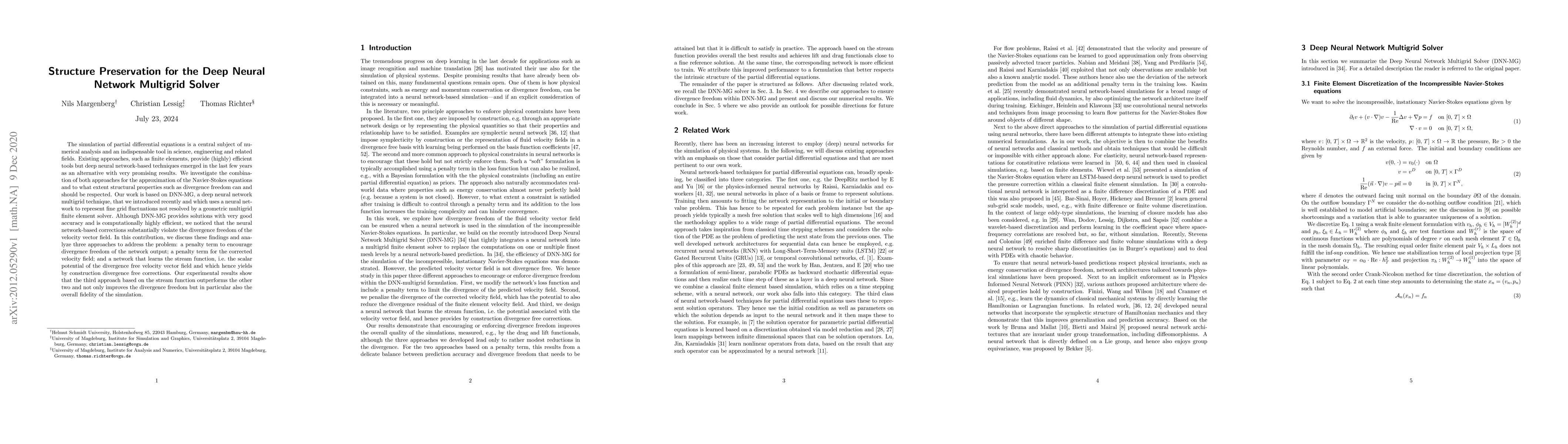 This paper explores combining deep neural networks with multigrid methods for solving the Navier-Stokes equations, highlighting issues with divergence freedom in neural network corrections. It proposes three solutions: a penalty term for network output, a penalty term for the corrected velocity field, and a neural network learning the stream function. The stream function-based approach is shown to best preserve structural properties and improve simulation accuracy.