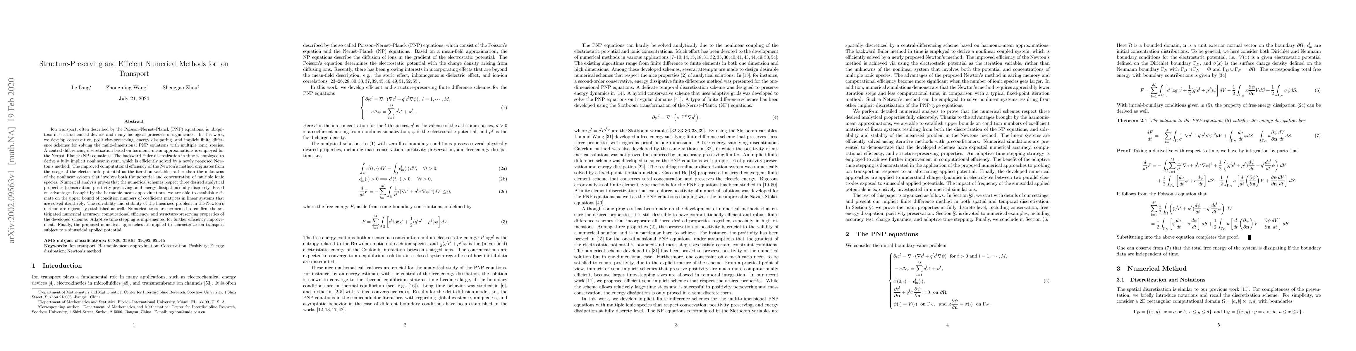 Ion transport, often described by the Poisson--Nernst--Planck (PNP) equations, is ubiquitous in electrochemical devices and many biological processes of significance. In this work, we develop conservative, positivity-preserving, energy dissipating, and implicit finite difference schemes for solving the multi-dimensional PNP equations with multiple ionic species. A central-differencing discretization based on harmonic-mean approximations is employed for the Nernst--Planck (NP) equations. The backward Euler discretization in time is employed to derive a fully implicit nonlinear system, which is efficiently solved by a newly proposed Newton's method. The improved computational efficiency of the Newton's method originates from the usage of the electrostatic potential as the iteration variable, rather than the unknowns of the nonlinear system that involves both the potential and concentration of multiple ionic species. Numerical analysis proves that the numerical schemes respect three desired analytical properties (conservation, positivity preserving, and energy dissipation) fully discretely. Based on advantages brought by the harmonic-mean approximations, we are able to establish estimate on the upper bound of condition numbers of coefficient matrices in linear systems that are solved iteratively. The solvability and stability of the linearized problem in the Newton's method are rigorously established as well. Numerical tests are performed to confirm the anticipated numerical accuracy, computational efficiency, and structure-preserving properties of the developed schemes. Adaptive time stepping is implemented for further efficiency improvement. Finally, the proposed numerical approaches are applied to characterize ion transport subject to a sinusoidal applied potential.
