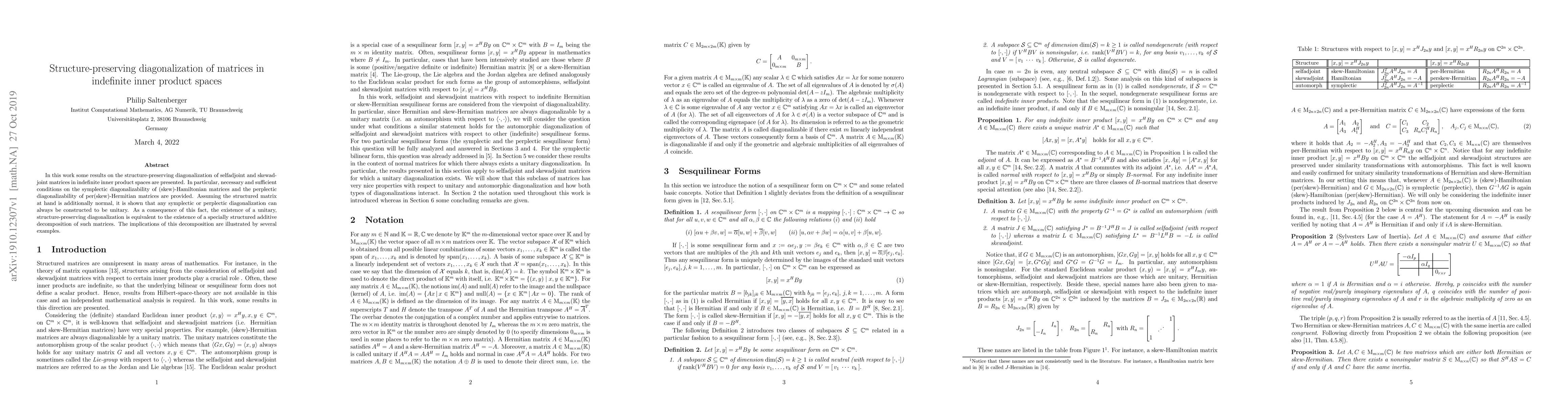 This paper presents conditions for the symplectic and perplectic diagonalization of selfadjoint and skewadjoint matrices in indefinite inner product spaces, showing that unitary diagonalization is possible for normal matrices. It concludes that unitary structure-preserving diagonalization exists if and only if a structured additive decomposition is possible, illustrated by examples.