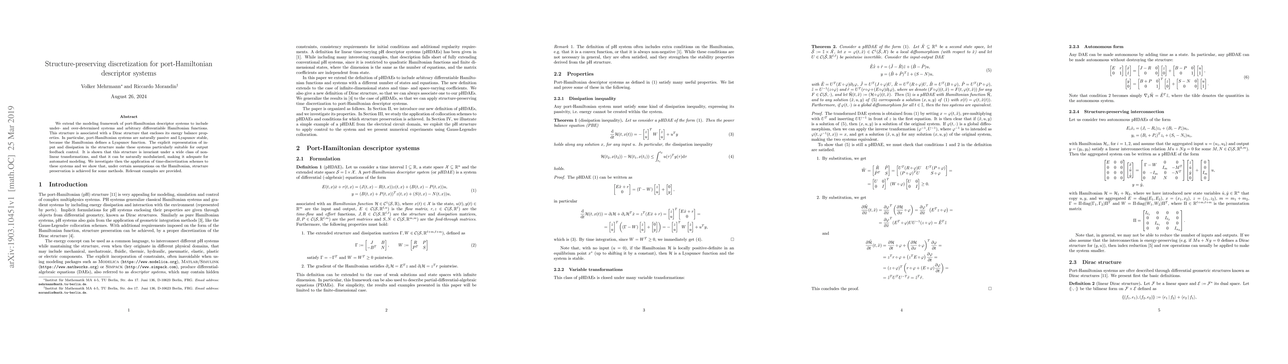 We extend the modeling framework of port-Hamiltonian descriptor systems to include under- and over-determined systems and arbitrary differentiable Hamiltonian functions. This structure is associated with a Dirac structure that encloses its energy balance properties. In particular, port-Hamiltonian systems are naturally passive and Lyapunov stable, because the Hamiltonian defines a Lyapunov function. The explicit representation of input and dissipation in the structure make these systems particularly suitable for output feedback control. It is shown that this structure is invariant under a wide class of nonlinear transformations, and that it can be naturally modularized, making it adequate for automated modeling. We investigate then the application of time-discretization schemes to these systems and we show that, under certain assumptions on the Hamiltonian, structure preservation is achieved for some methods. Numerical examples are provided.