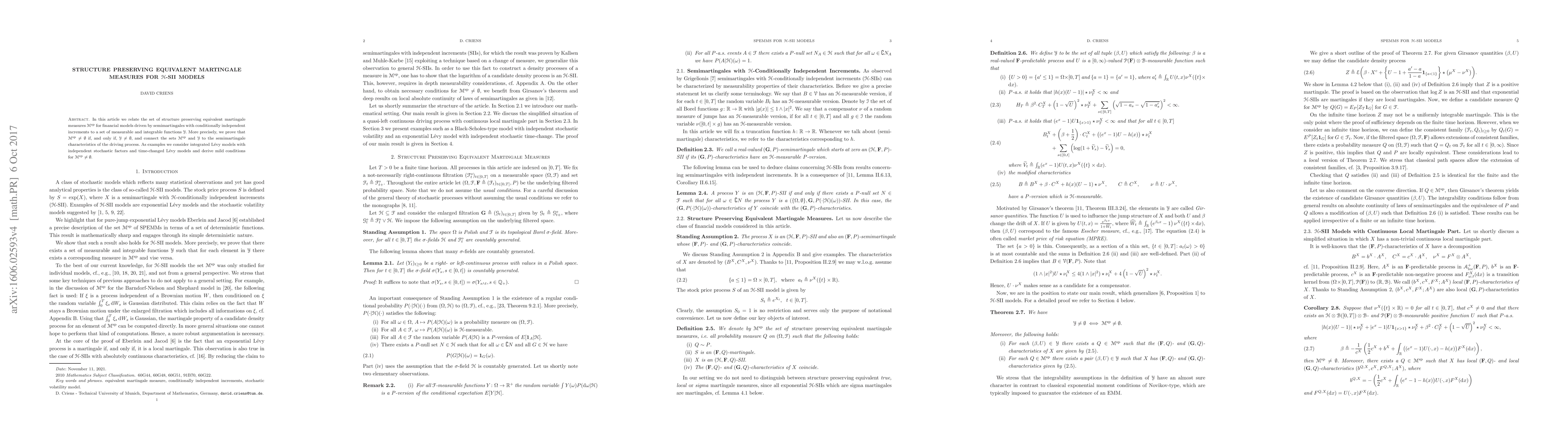 In this article we relate the set of structure preserving equivalent martingale measures $(\mathcal{M})$ for financial models driven by semimartingales with conditionally independent increments to a set of measurable and integrable functions $(\mathscr{Y})$. More precisely, we prove that $(\mathcal{M}\not = \emptyset)$ if, and only if, $(\mathscr{Y}\not = \emptyset)$, and connect the sets $(\mathcal{M})$ and $(\mathscr{Y})$ to the semimartingale characteristics of the driving process. As examples we consider integrated L\'evy models with independent stochastic factors and time-changed L\'evy models and derive mild conditions for $(\mathcal{M} \not = \emptyset)$.
