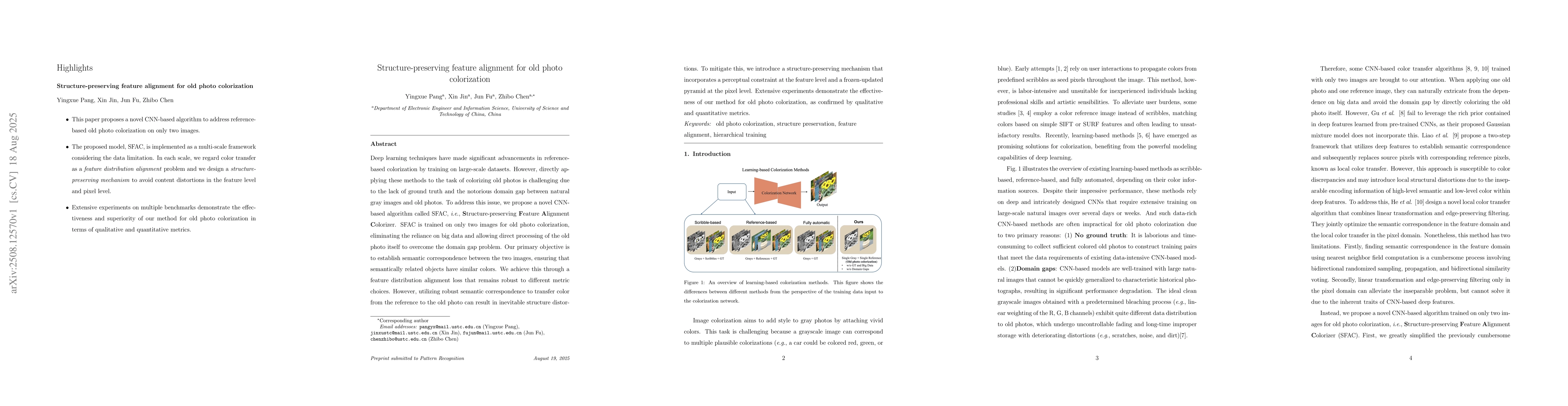 The paper introduces SFAC, a CNN-based algorithm for colorizing old photos using only two images, addressing the domain gap issue. It establishes semantic correspondence for color transfer, mitigating structure distortions with a structure-preserving mechanism, achieving effective colorization via extensive experiments.