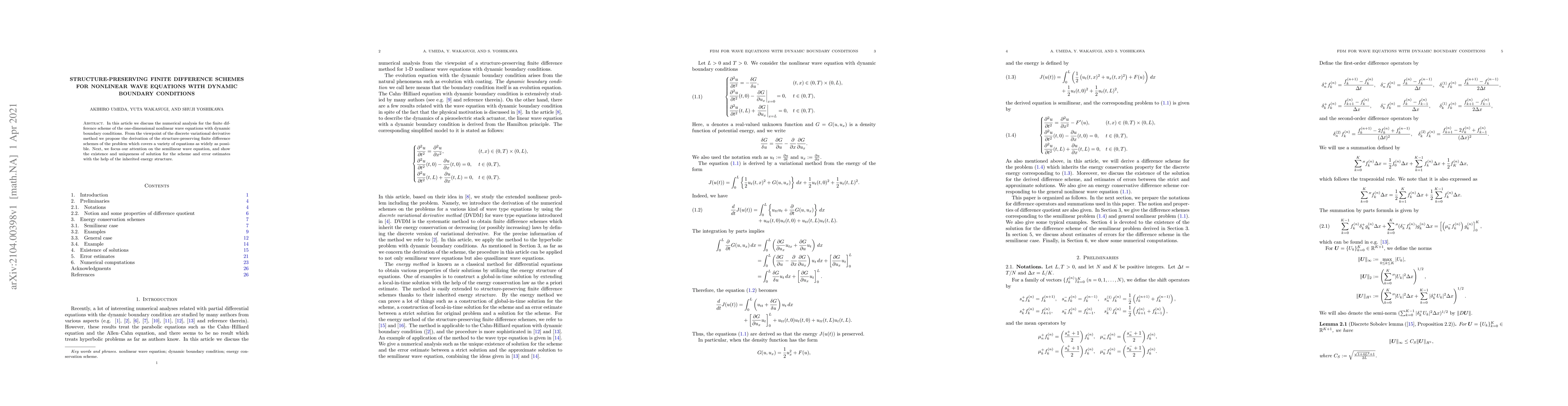 This paper proposes structure-preserving finite difference schemes for one-dimensional nonlinear wave equations with dynamic boundary conditions, derived via the discrete variational derivative method. It demonstrates the existence and uniqueness of solutions for the semilinear wave equation and provides error estimates using an inherited energy structure.