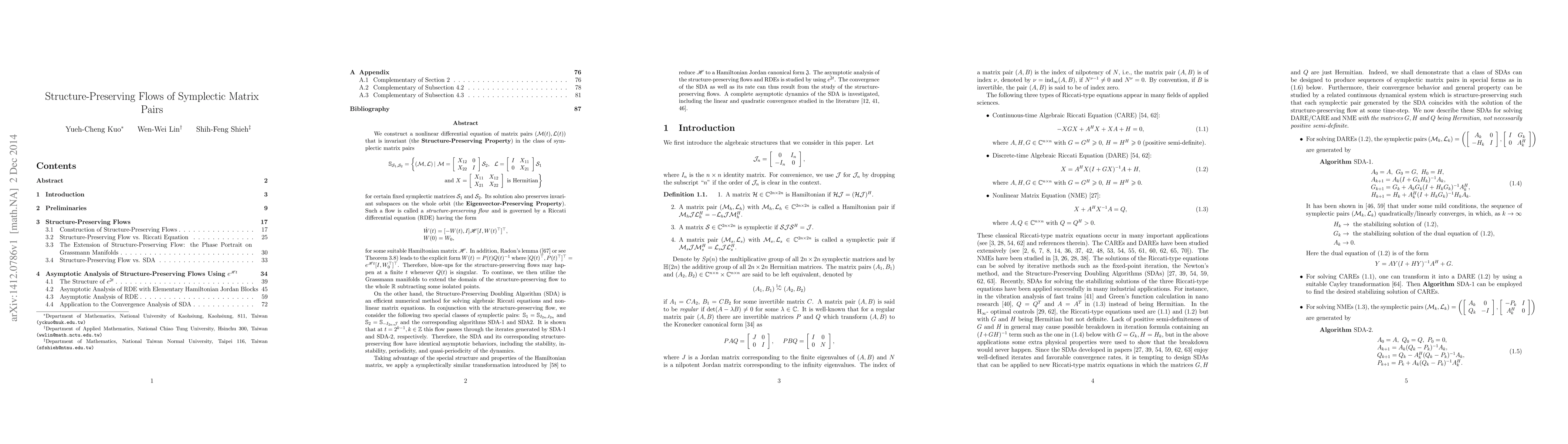 This research constructs a nonlinear differential equation for symplectic matrix pairs, ensuring both structure and eigenvector preservation, termed 'structure-preserving flow.' It's governed by a Riccati differential equation (RDE) and utilizes Radon's lemma for explicit form, allowing for finite blow-ups. The domain is extended to all real numbers, excluding isolated points, using Grassmann manifolds.