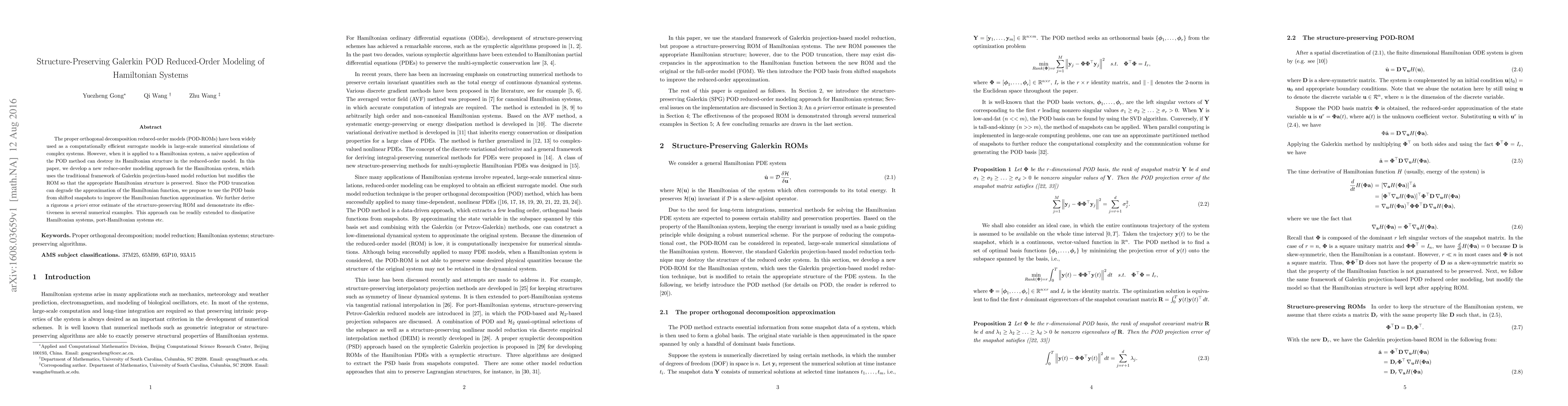 The research develops structure-preserving Galerkin Proper Orthogonal Decomposition (POD) reduced-order models (ROMs) for Hamiltonian systems, ensuring the preservation of Hamiltonian structure in the reduced models by modifying the ROM's coefficient matrix using POD basis from shifted snapshots.