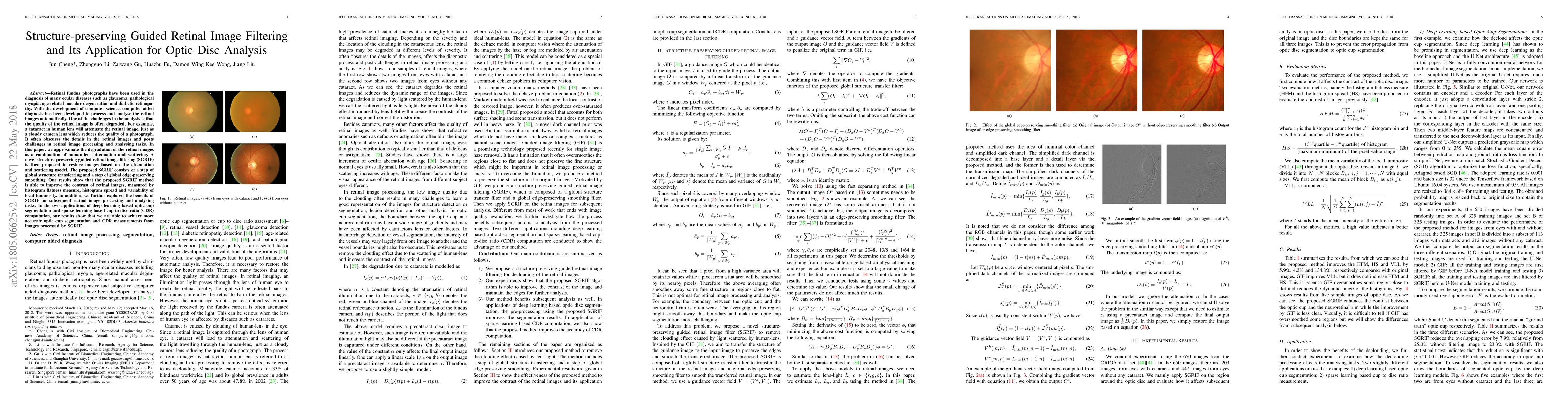 This paper proposes a novel structure-preserving guided retinal image filtering (SGRIF) method to restore the quality of retinal images degraded by human-lens attenuation and scattering. The SGRIF method improves image contrast and enhances subsequent optic disc analysis tasks, including deep learning-based optic cup segmentation and sparse learning-based cup-to-disc ratio computation.