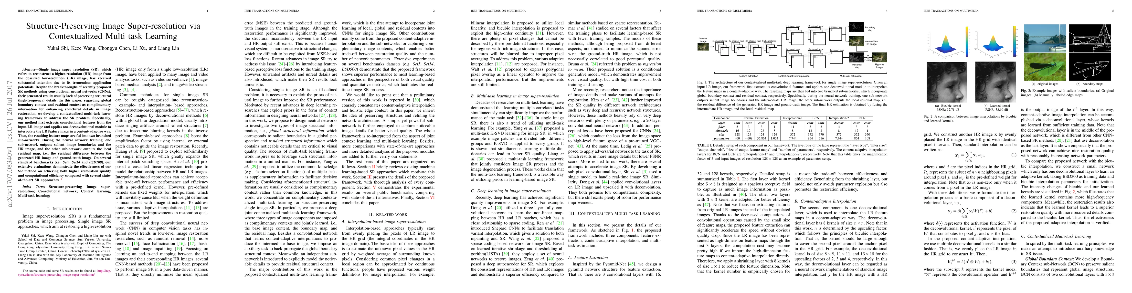 This paper proposes a contextualized multi-task learning framework for single image super-resolution, aiming to enhance structural details by leveraging global boundary context and residual context. The method uses a deconvolutional module and two branched sub-networks to generate high-resolution images with improved structural preservation, achieving superior results on standard benchmarks compared to state-of-the-art methods.