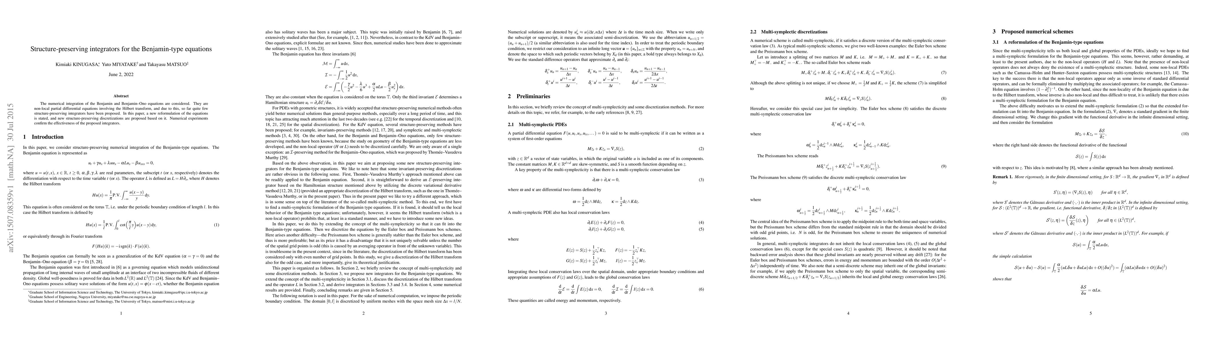 The numerical integration of the Benjamin and Benjamin--Ono equations are considered. They are non-local partial differential equations involving the Hilbert transform, and due to this, so far quite few structure-preserving integrators have been proposed. In this paper, a new reformulation of the equations is stated, and new structure-preserving discretizations are proposed based on it. Numerical experiments confirm the effectiveness of the proposed integrators.