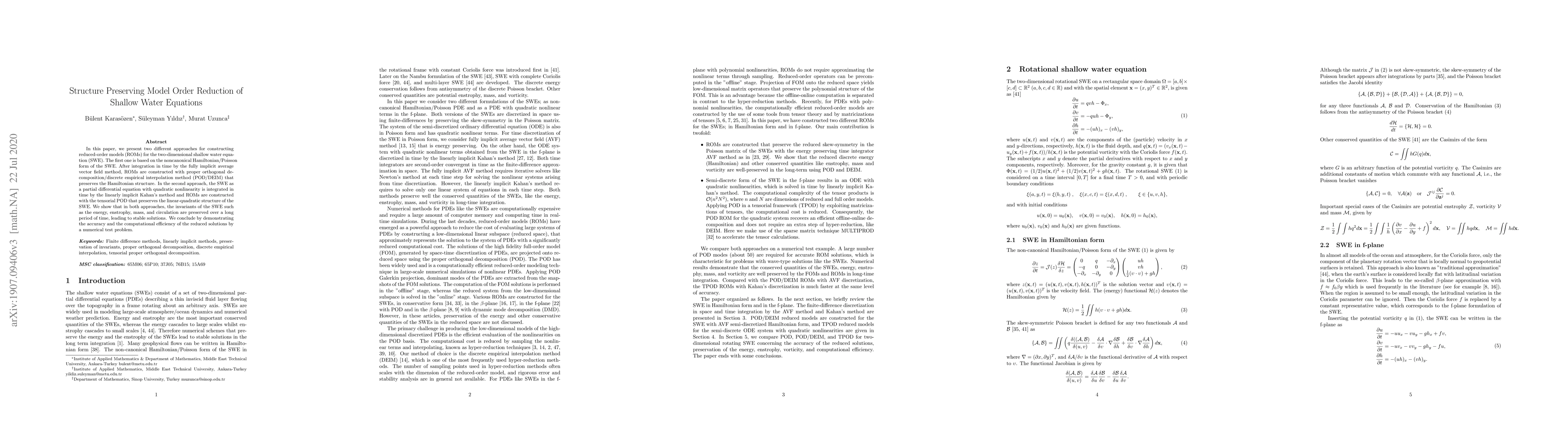 This paper presents two model order reduction methods for the two-dimensional shallow water equations, preserving their Hamiltonian and linear-quadratic structures. Both approaches maintain key invariants over time, demonstrating stable, accurate, and efficient reduced solutions.