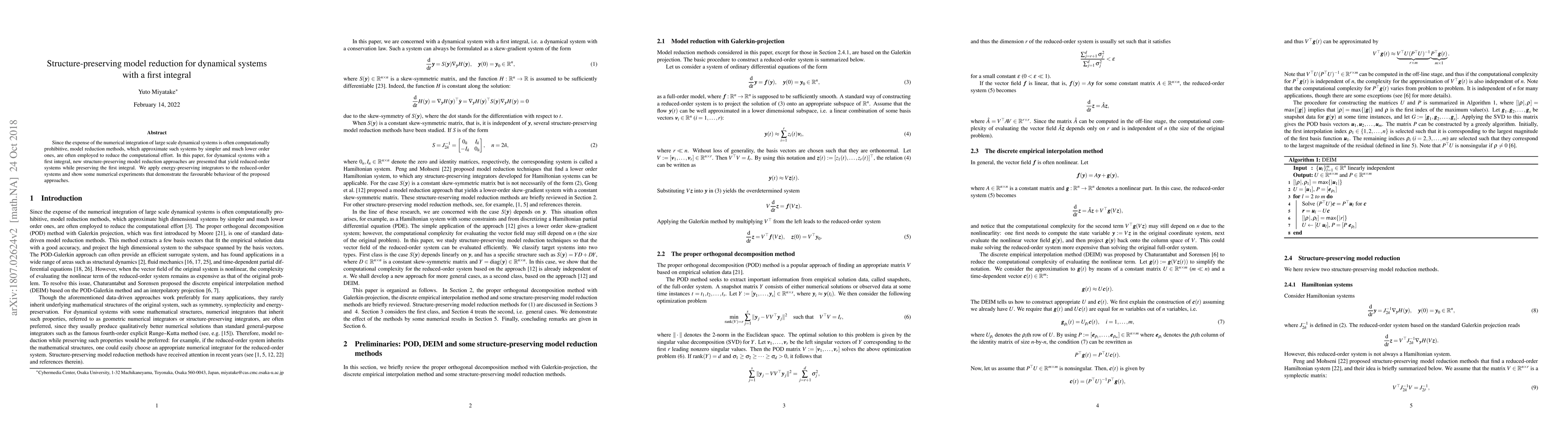 This paper introduces new structure-preserving model reduction techniques for large-scale dynamical systems with a first integral, ensuring reduced-order systems retain the original integral. It employs energy-preserving integrators and demonstrates favorable numerical behavior through experiments.
