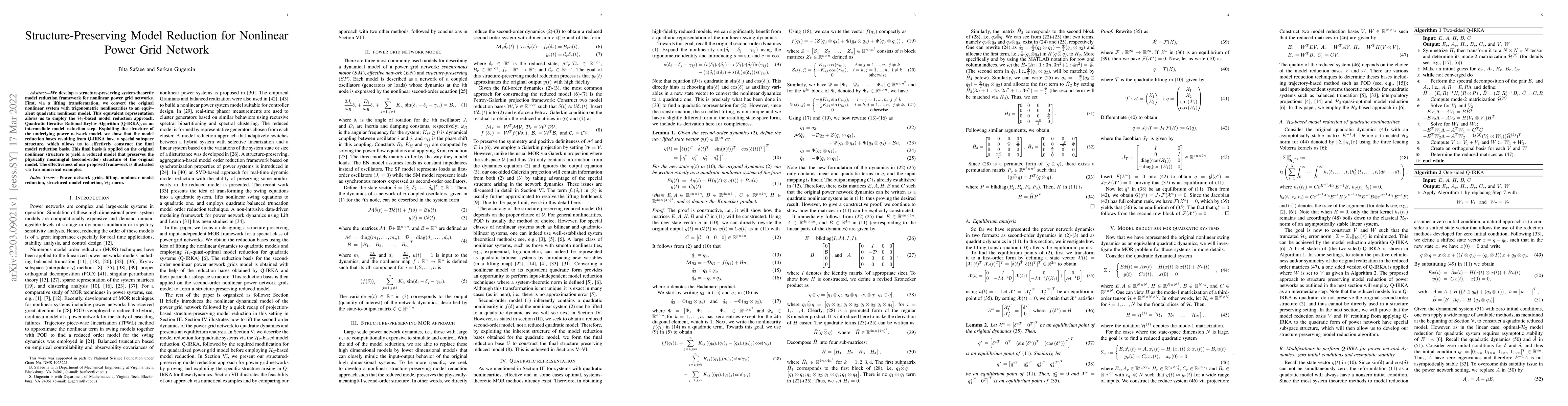 This paper proposes a structure-preserving model reduction framework for nonlinear power grid networks, converting the original system to a quadratic nonlinear model and employing the Q-IRKA method for intermediate reduction. The final reduced model preserves the original system's physically meaningful structure, validated by numerical examples.