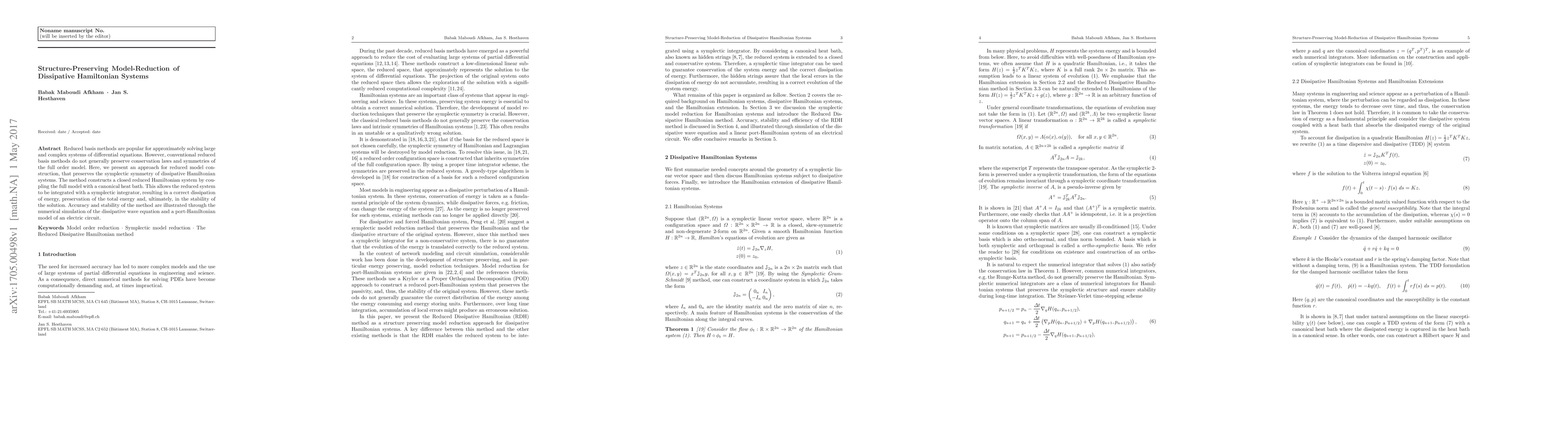 This paper proposes a method for constructing reduced models that preserve the symplectic symmetry of dissipative Hamiltonian systems, ensuring accurate dissipation of energy and stability. The approach integrates the full system with a canonical heat bath, enabling the use of symplectic integrators for the reduced model.