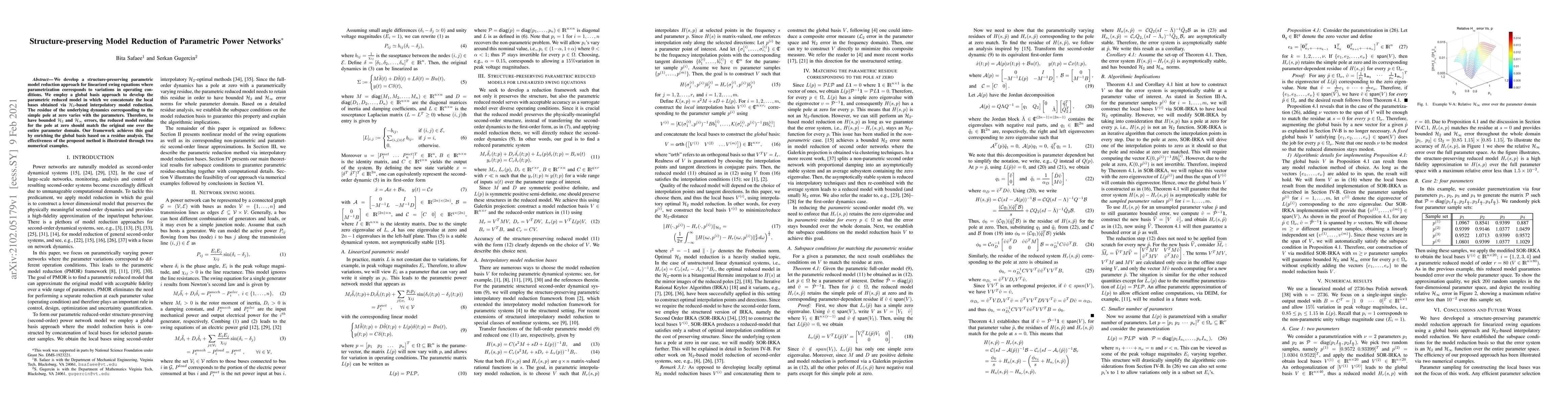 This paper proposes a structure-preserving method for reducing parametric models of linearized power network swing equations, ensuring bounded $\mathcal{H}_2$ and $\mathcal{H}_\infty$ errors by matching the residue of the pole at zero across the parameter domain. The method uses a global basis enriched via residue analysis to achieve this goal, demonstrated through numerical examples.