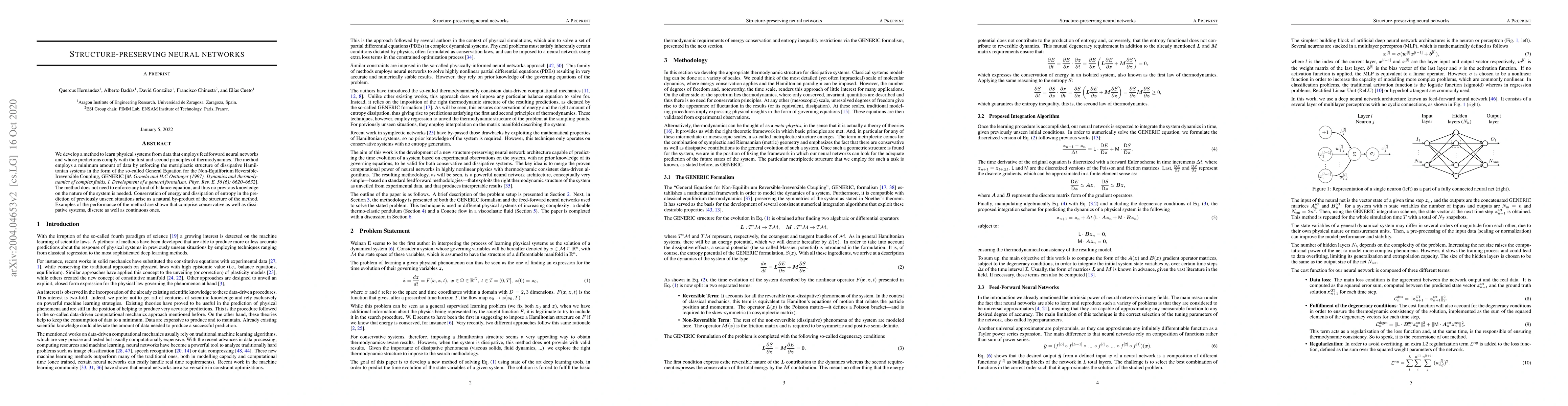 We develop a method to learn physical systems from data that employs feedforward neural networks and whose predictions comply with the first and second principles of thermodynamics. The method employs a minimum amount of data by enforcing the metriplectic structure of dissipative Hamiltonian systems in the form of the so-called General Equation for the Non-Equilibrium Reversible-Irreversible Coupling, GENERIC [M. Grmela and H.C Oettinger (1997). Dynamics and thermodynamics of complex fluids. I. Development of a general formalism. Phys. Rev. E. 56 (6): 6620-6632]. The method does not need to enforce any kind of balance equation, and thus no previous knowledge on the nature of the system is needed. Conservation of energy and dissipation of entropy in the prediction of previously unseen situations arise as a natural by-product of the structure of the method. Examples of the performance of the method are shown that include conservative as well as dissipative systems, discrete as well as continuous ones.