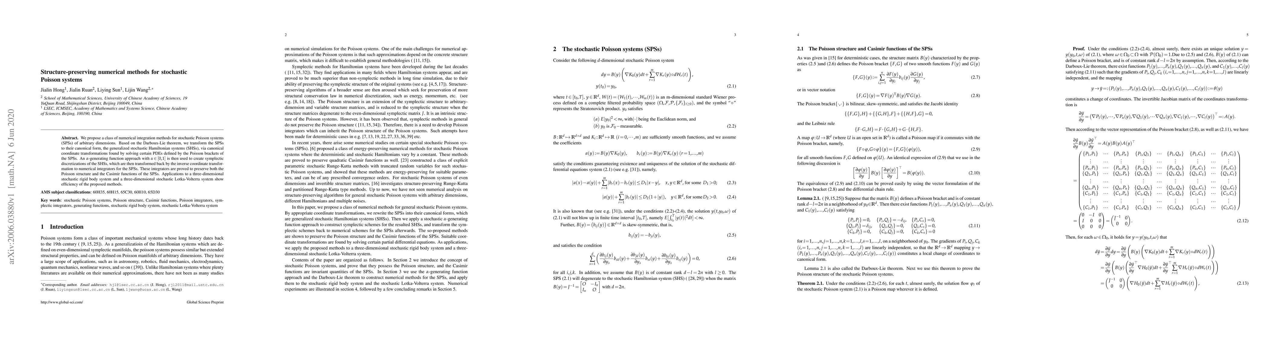 This paper proposes a novel class of structure-preserving numerical methods for stochastic Poisson systems, transforming them into generalized stochastic Hamiltonian systems and creating symplectic discretizations that preserve the original system's Poisson structure and Casimir functions. Applications demonstrate the methods' efficiency in complex systems like stochastic rigid bodies and Lotka-Volterra models.