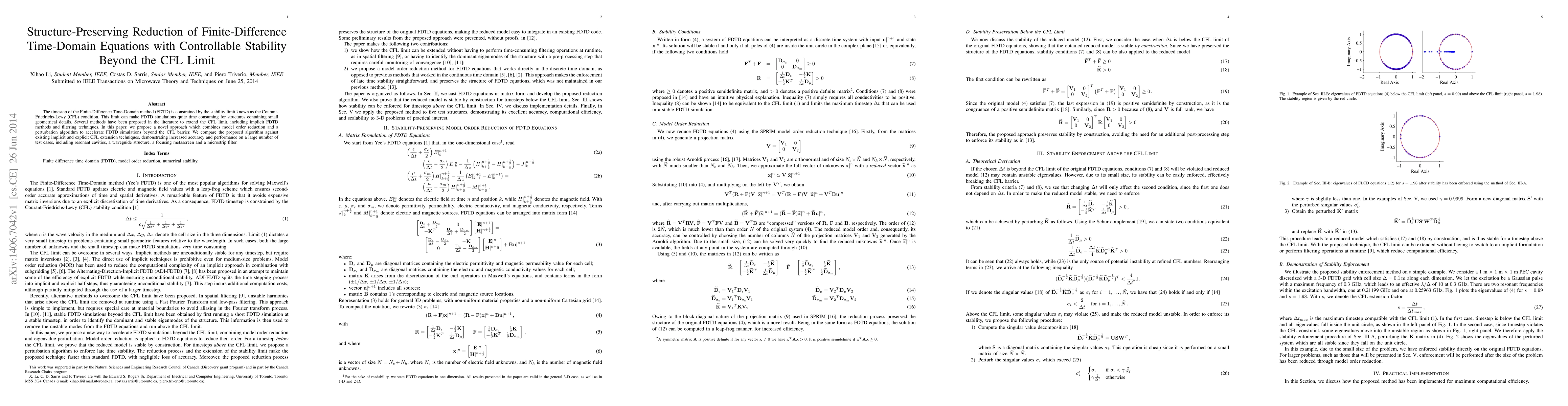 The timestep of the Finite-Difference Time-Domain method (FDTD) is constrained by the stability limit known as the Courant-Friedrichs-Lewy (CFL) condition. This limit can make FDTD simulations quite time consuming for structures containing small geometrical details. Several methods have been proposed in the literature to extend the CFL limit, including implicit FDTD methods and filtering techniques. In this paper, we propose a novel approach which combines model order reduction and a perturbation algorithm to accelerate FDTD simulations beyond the CFL barrier. We compare the proposed algorithm against existing implicit and explicit CFL extension techniques, demonstrating increased accuracy and performance on a large number of test cases, including resonant cavities, a waveguide structure, a focusing metascreen and a microstrip filter.