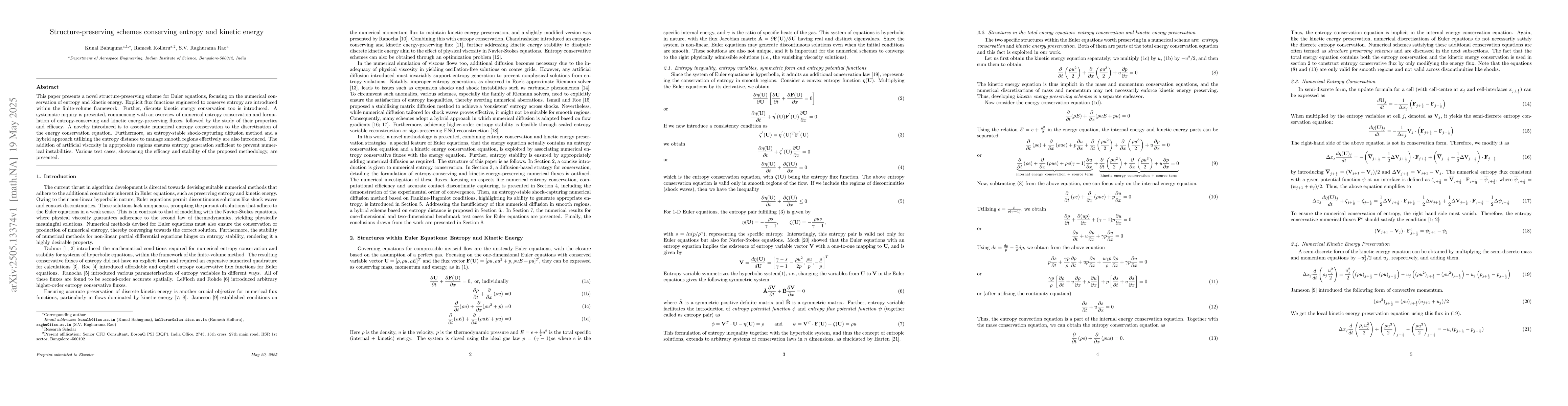 This paper presents a novel structure-preserving scheme for Euler equations, focusing on the numerical conservation of entropy and kinetic energy. Explicit flux functions engineered to conserve entropy are introduced within the finite-volume framework. Further, discrete kinetic energy conservation too is introduced. A systematic inquiry is presented, commencing with an overview of numerical entropy conservation and formulation of entropy-conserving and kinetic energy-preserving fluxes, followed by the study of their properties and efficacy. A novelty introduced is to associate numerical entropy conservation to the discretization of the energy conservation equation. Furthermore, an entropy-stable shock-capturing diffusion method and a hybrid approach utilizing the entropy distance to manage smooth regions effectively are also introduced. The addition of artificial viscosity in appropriate regions ensures entropy generation sufficient to prevent numerical instabilities. Various test cases, showcasing the efficacy and stability of the proposed methodology, are presented.