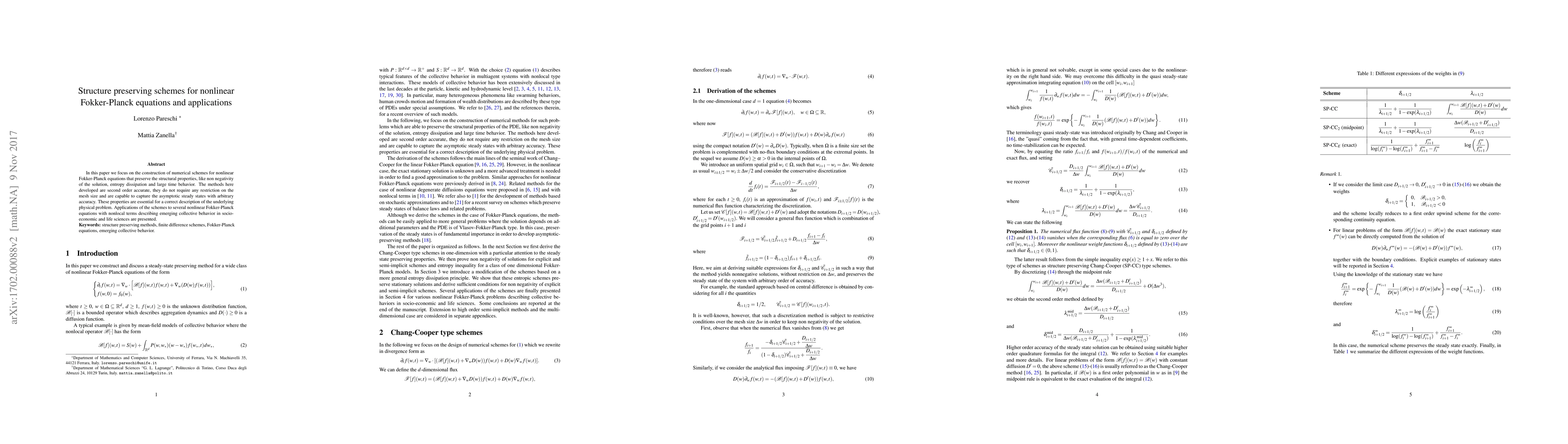 This paper develops second-order accurate numerical schemes for nonlinear Fokker-Planck equations that maintain structural properties such as non-negativity, entropy dissipation, and large time behavior, and applies these methods to model collective behavior in socio-economic and life sciences.
