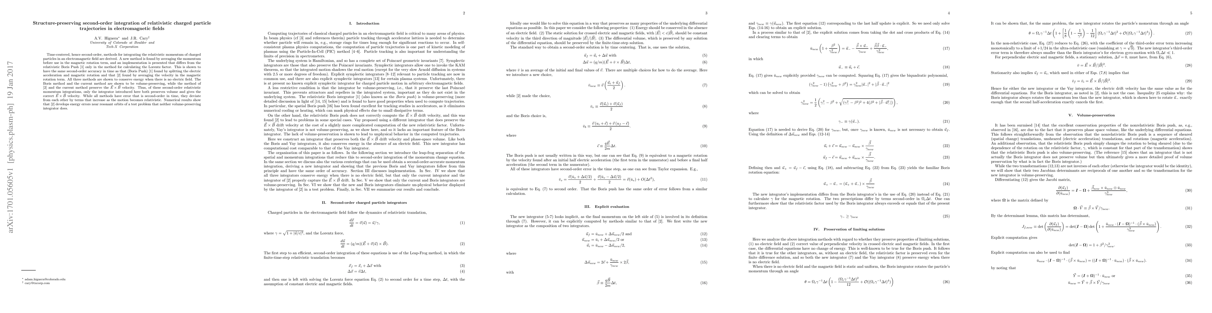 This paper presents a new second-order integration method for relativistic charged particle trajectories in electromagnetic fields, differing from the Boris Push method primarily in the calculation of the Lorentz factor. It preserves both volume and the $\vec{E} \times \vec{B}$ velocity, unlike other methods, and shows numerical stability in test problems.