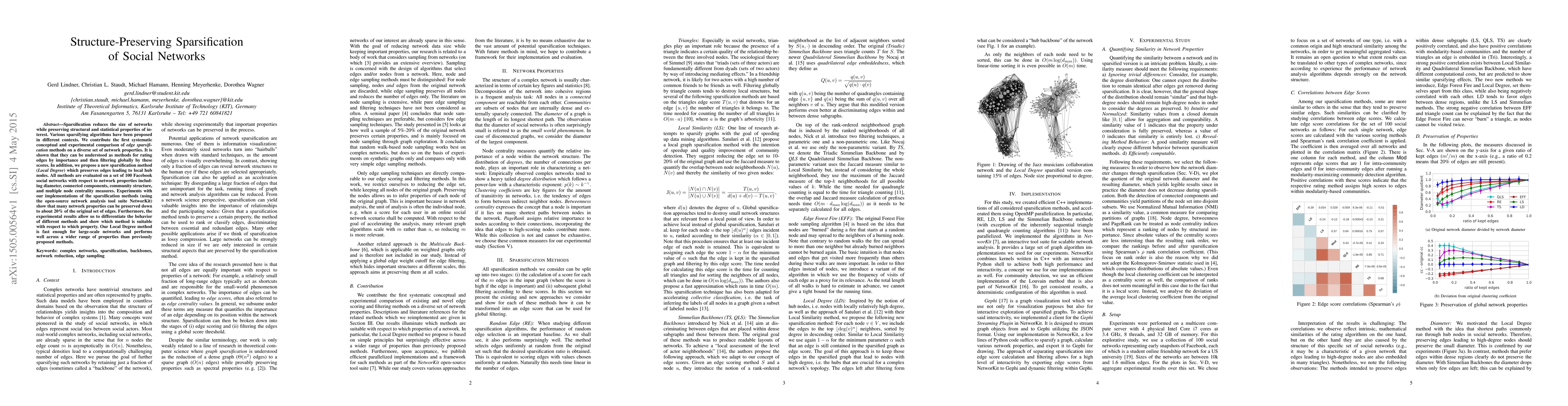 Sparsification reduces the size of networks while preserving structural and statistical properties of interest. Various sparsifying algorithms have been proposed in different contexts. We contribute the first systematic conceptual and experimental comparison of \textit{edge sparsification} methods on a diverse set of network properties. It is shown that they can be understood as methods for rating edges by importance and then filtering globally by these scores. In addition, we propose a new sparsification method (\textit{Local Degree}) which preserves edges leading to local hub nodes. All methods are evaluated on a set of 100 Facebook social networks with respect to network properties including diameter, connected components, community structure, and multiple node centrality measures. Experiments with our implementations of the sparsification methods (using the open-source network analysis tool suite NetworKit) show that many network properties can be preserved down to about 20\% of the original set of edges. Furthermore, the experimental results allow us to differentiate the behavior of different methods and show which method is suitable with respect to which property. Our Local Degree method is fast enough for large-scale networks and performs well across a wider range of properties than previously proposed methods.