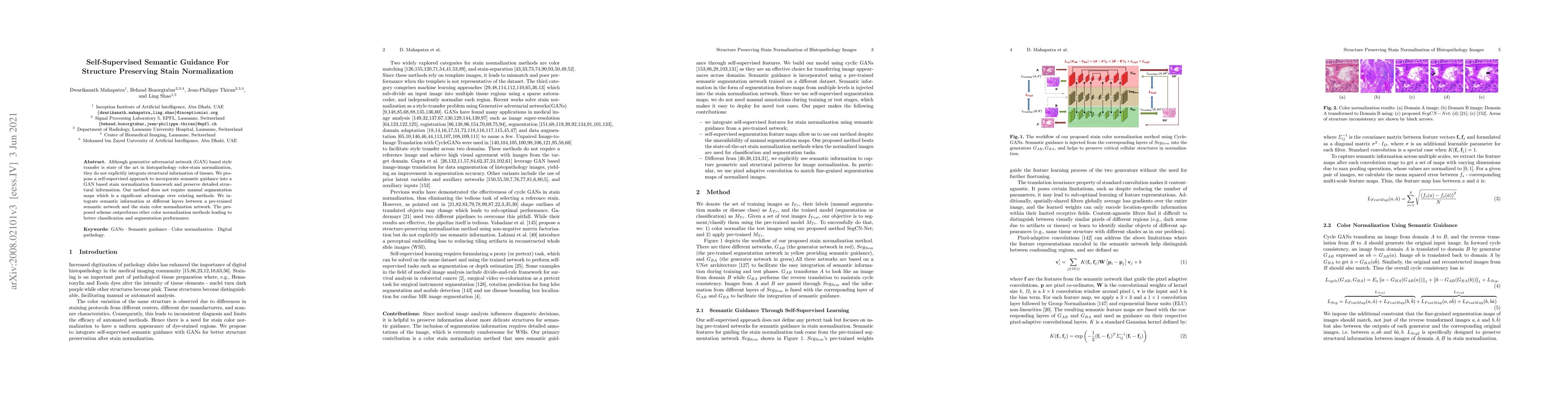 This paper proposes a self-supervised method for histopathology image stain normalization using GANs that integrates semantic guidance to preserve tissue structure. Unlike existing methods, this approach does not require manual segmentation maps, achieving better classification and segmentation performance.