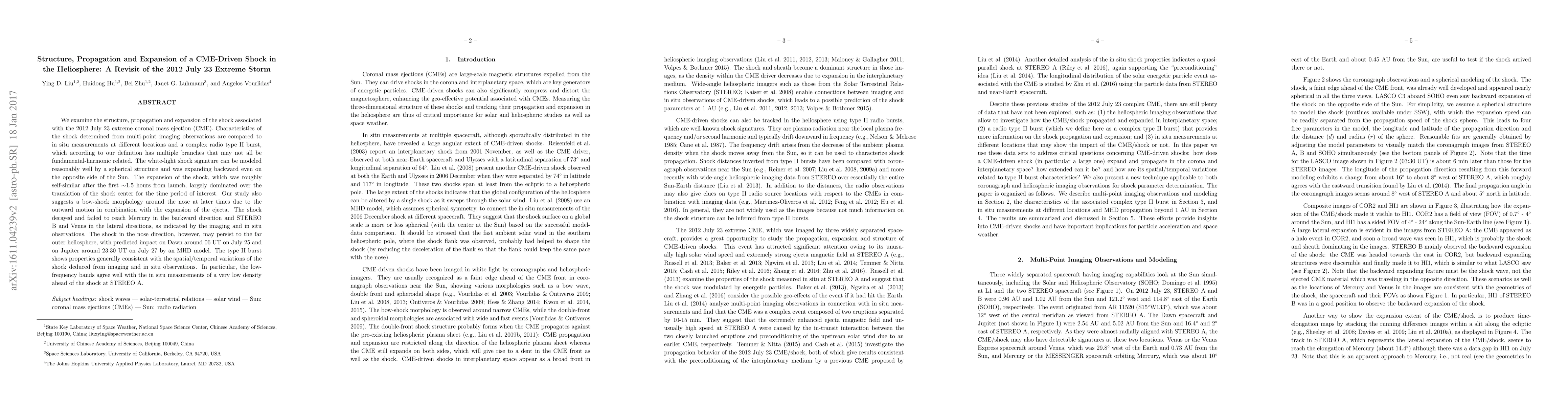 We examine the structure, propagation and expansion of the shock associated with the 2012 July 23 extreme coronal mass ejection (CME). Characteristics of the shock determined from multi-point imaging observations are compared to in situ measurements at different locations and a complex radio type II burst, which according to our definition has multiple branches that may not all be fundamental-harmonic related. The white-light shock signature can be modeled reasonably well by a spherical structure and was expanding backward even on the opposite side of the Sun. The expansion of the shock, which was roughly self-similar after the first $\sim$1.5 hours from launch, largely dominated over the translation of the shock center for the time period of interest. Our study also suggests a bow-shock morphology around the nose at later times due to the outward motion in combination with the expansion of the ejecta. The shock decayed and failed to reach Mercury in the backward direction and STEREO B and Venus in the lateral directions, as indicated by the imaging and in situ observations. The shock in the nose direction, however, may persist to the far outer heliosphere, with predicted impact on Dawn around 06 UT on July 25 and on Jupiter around 23:30 UT on July 27 by an MHD model. The type II burst shows properties generally consistent with the spatial/temporal variations of the shock deduced from imaging and in situ observations. In particular, the low-frequency bands agree well with the in situ measurements of a very low density ahead of the shock at STEREO A.