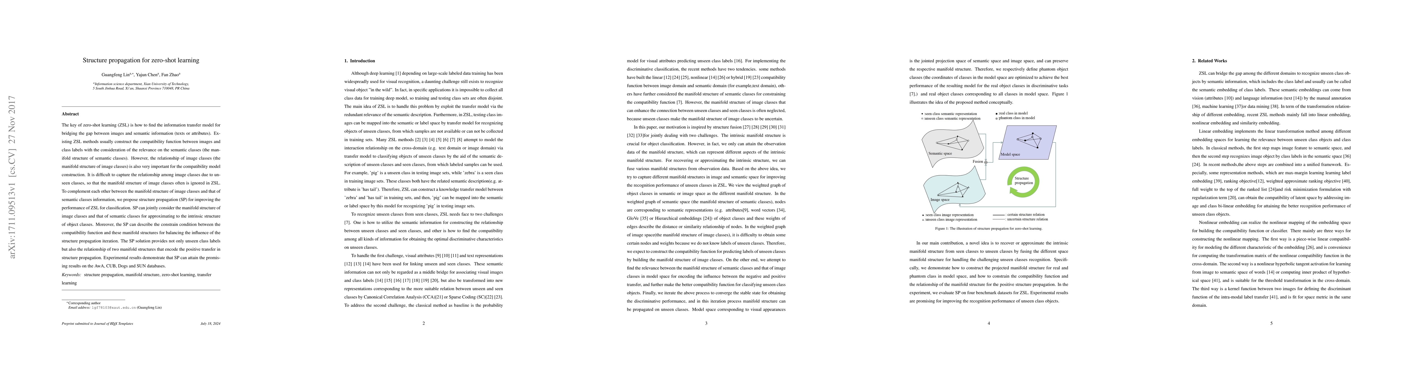 The key of zero-shot learning (ZSL) is how to find the information transfer model for bridging the gap between images and semantic information (texts or attributes). Existing ZSL methods usually construct the compatibility function between images and class labels with the consideration of the relevance on the semantic classes (the manifold structure of semantic classes). However, the relationship of image classes (the manifold structure of image classes) is also very important for the compatibility model construction. It is difficult to capture the relationship among image classes due to unseen classes, so that the manifold structure of image classes often is ignored in ZSL. To complement each other between the manifold structure of image classes and that of semantic classes information, we propose structure propagation (SP) for improving the performance of ZSL for classification. SP can jointly consider the manifold structure of image classes and that of semantic classes for approximating to the intrinsic structure of object classes. Moreover, the SP can describe the constrain condition between the compatibility function and these manifold structures for balancing the influence of the structure propagation iteration. The SP solution provides not only unseen class labels but also the relationship of two manifold structures that encode the positive transfer in structure propagation. Experimental results demonstrate that SP can attain the promising results on the AwA, CUB, Dogs and SUN databases.